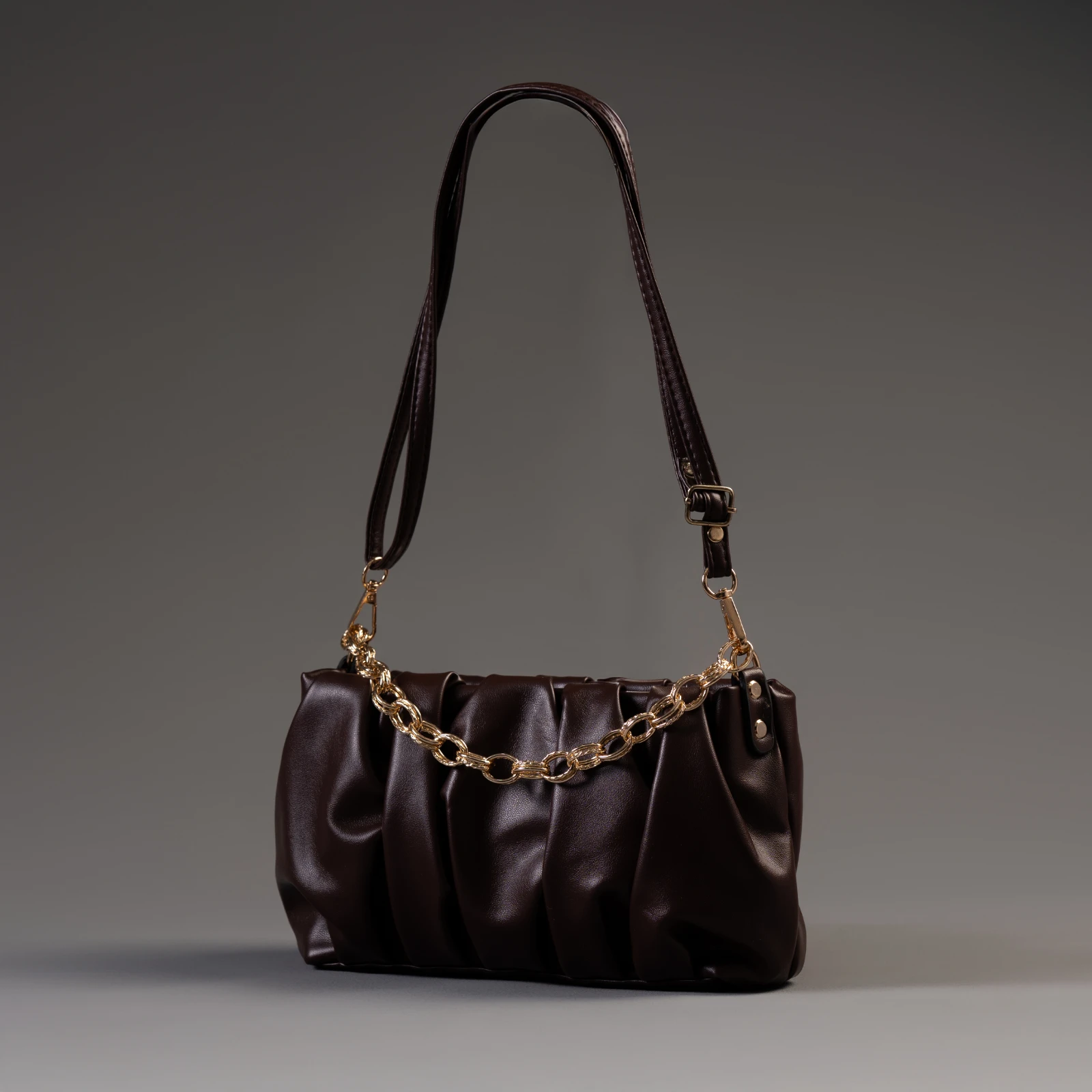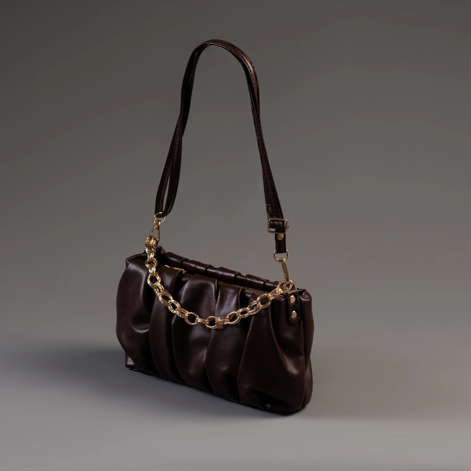Effortlessly chic, this ladies' leather shoulder bag features a luxurious gold chain strap for a tou...