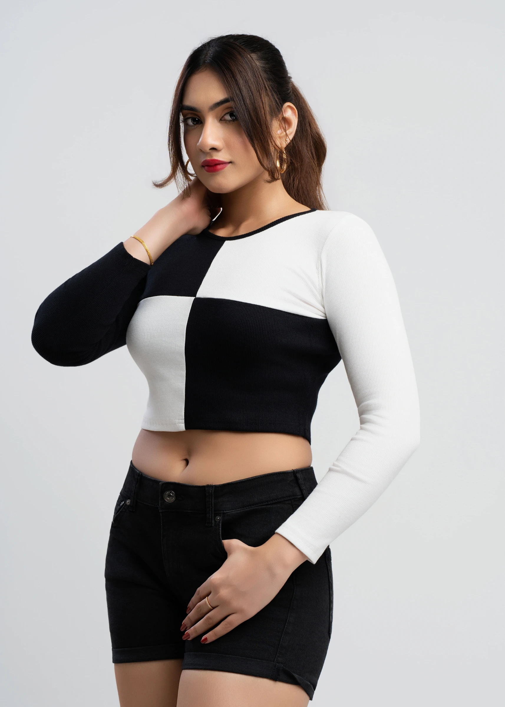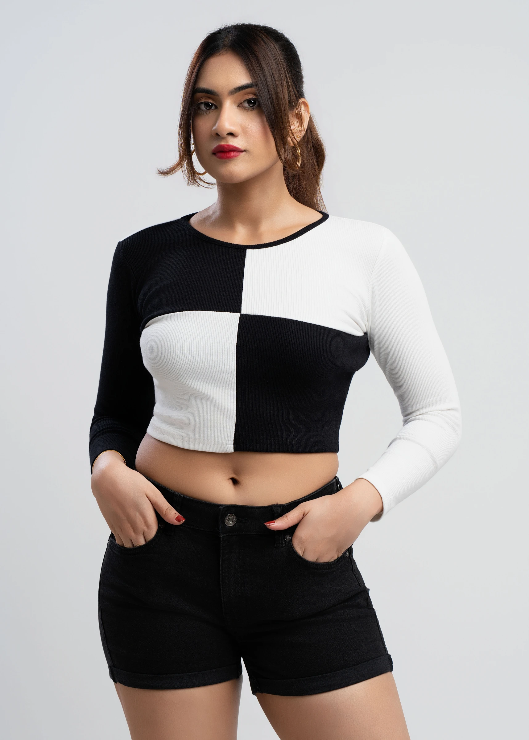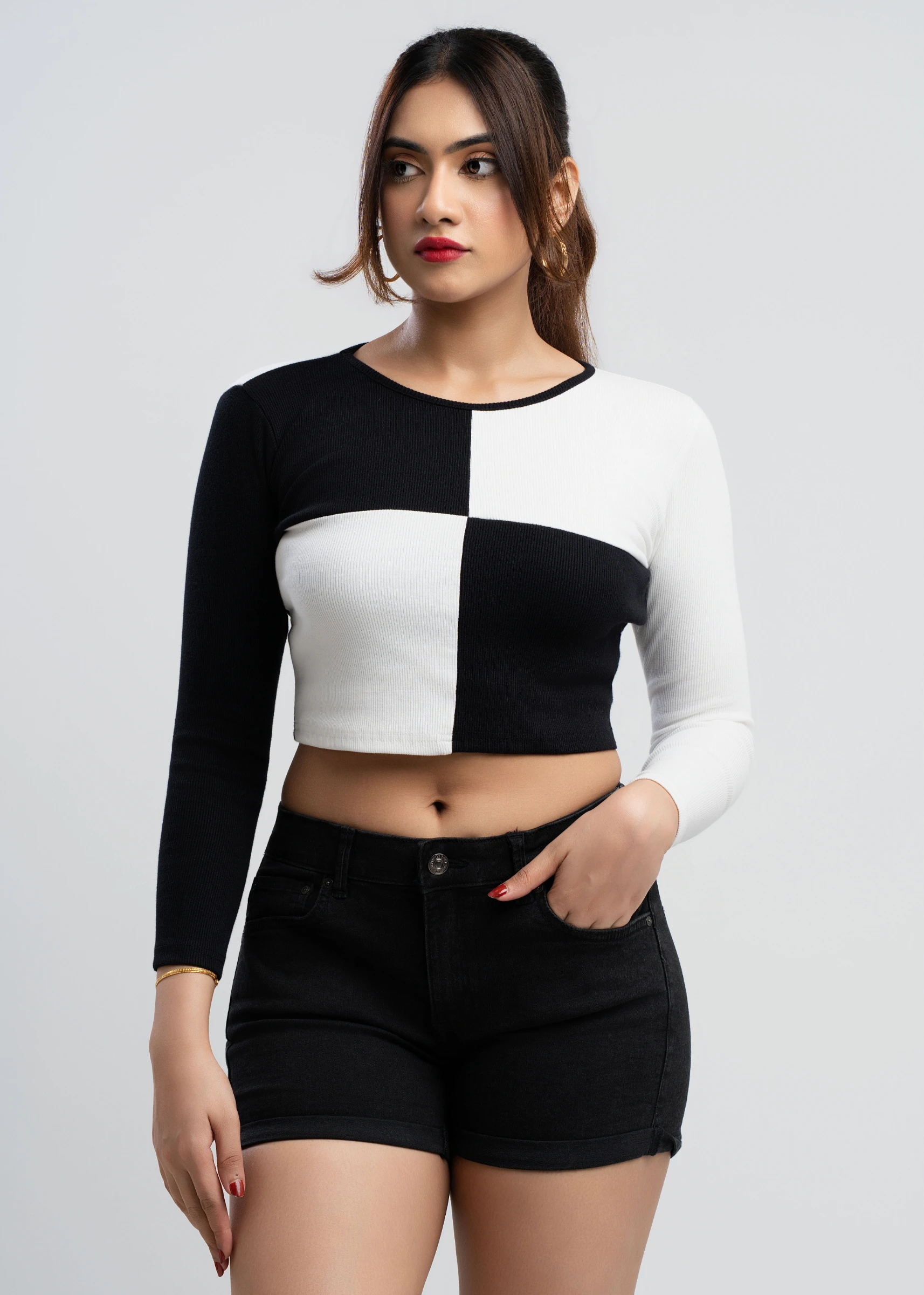 Effortlessly chic, the Tee Love Black & White Colorblock Crop Top is a versatile wardrobe essential....