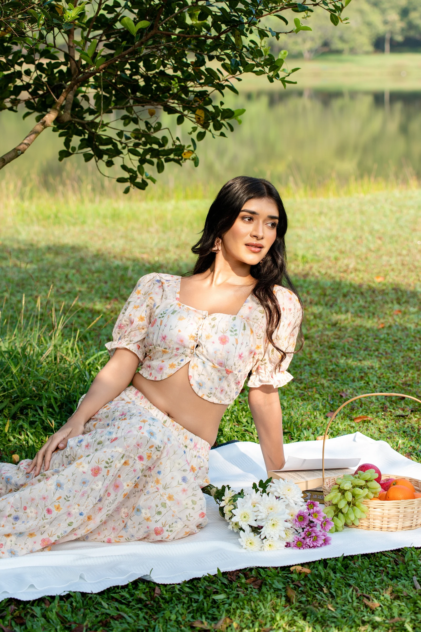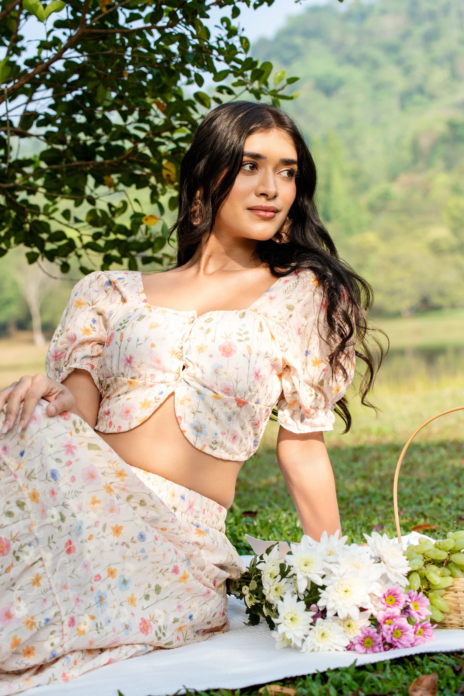 Embrace effortless charm with the Tee Love Floral Printed Gathered Short Sleeve Square Neck Crop Top...