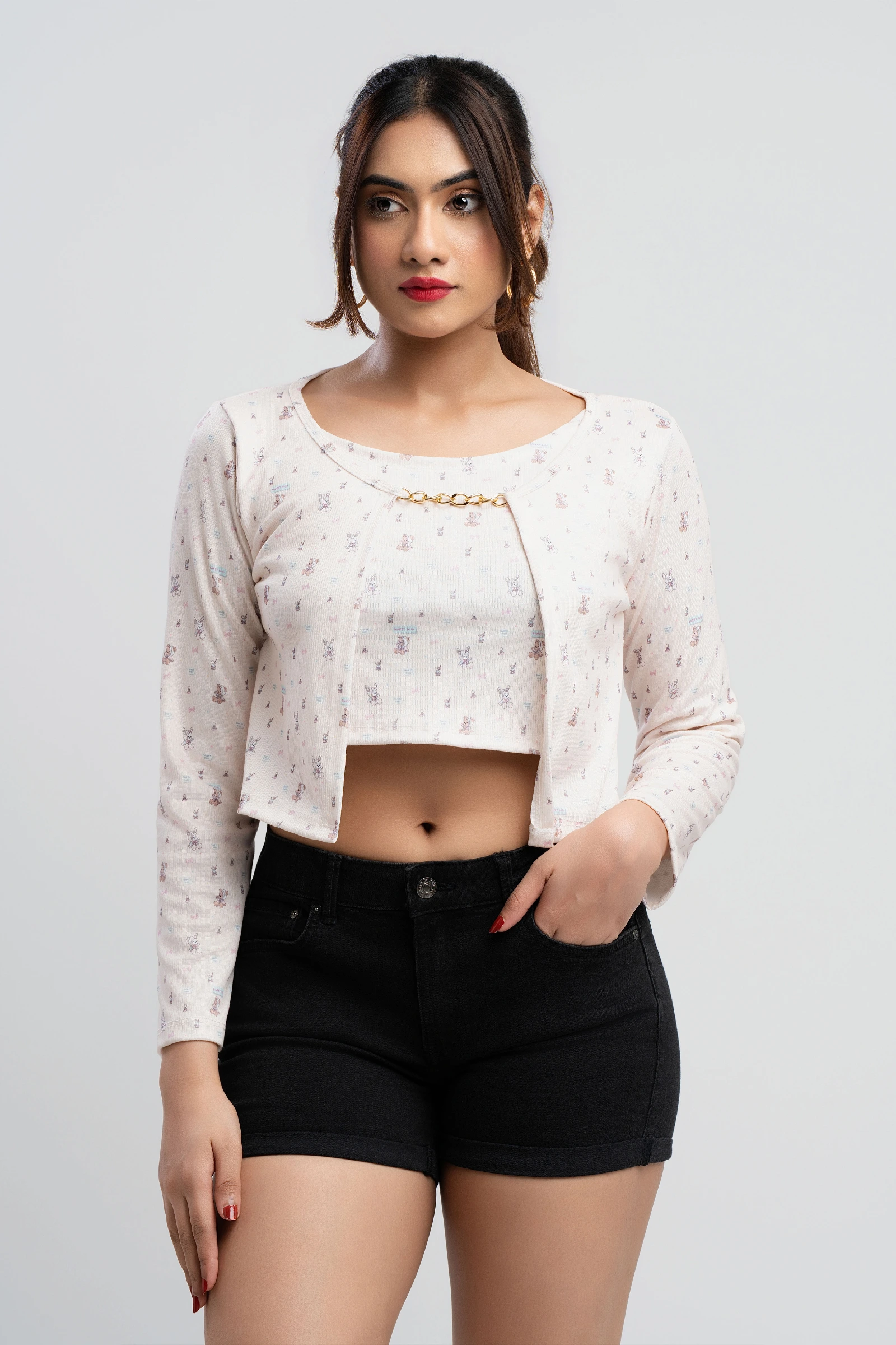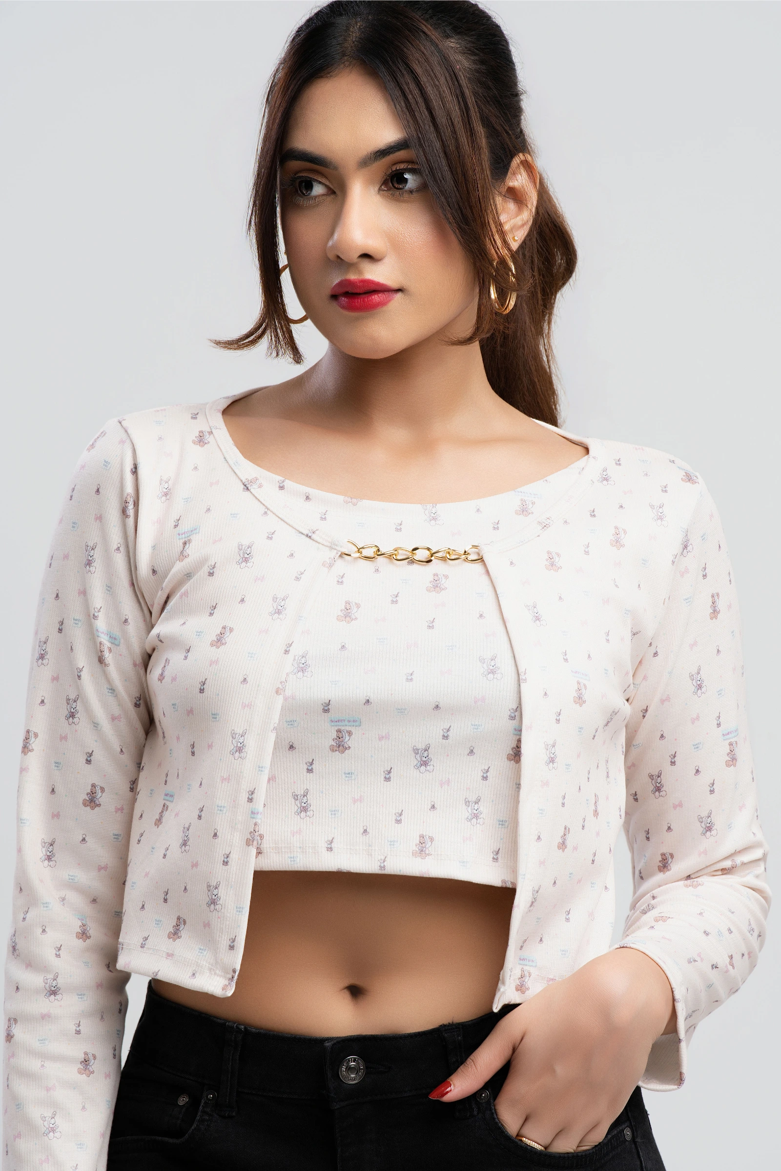 Channel your inner trendsetter with the Tee Love Front Chain Printed Long Sleeve Crop Top. This chic...