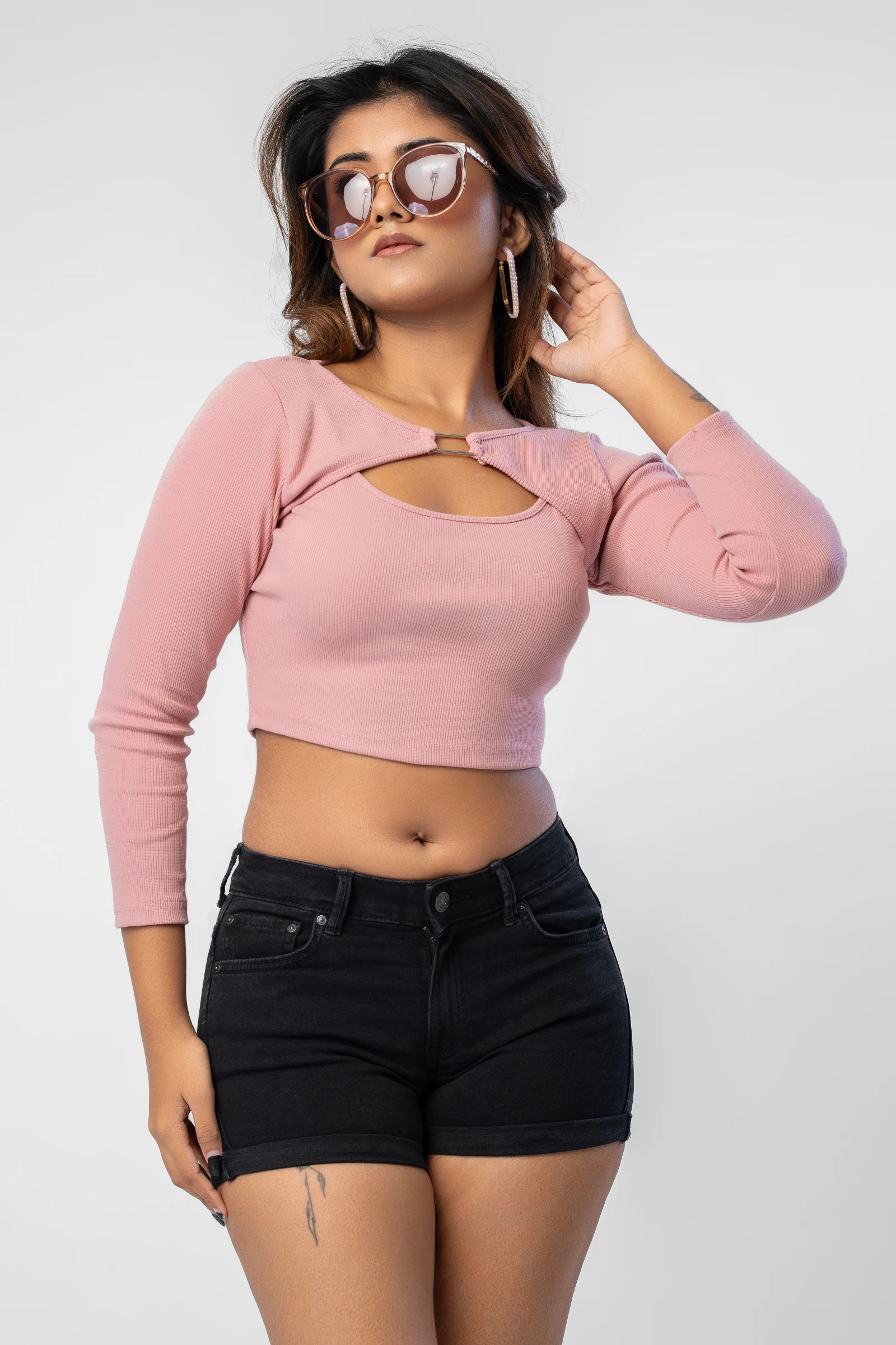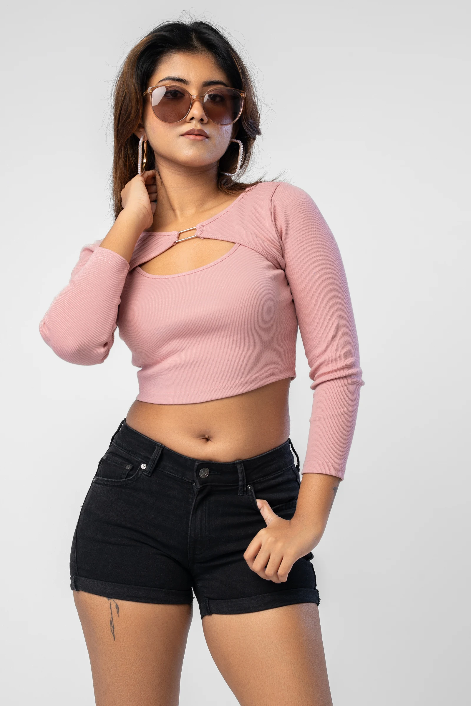 Show off your style with this fitted, long-sleeve crop top featuring a trendy front cut-out. Perfec...