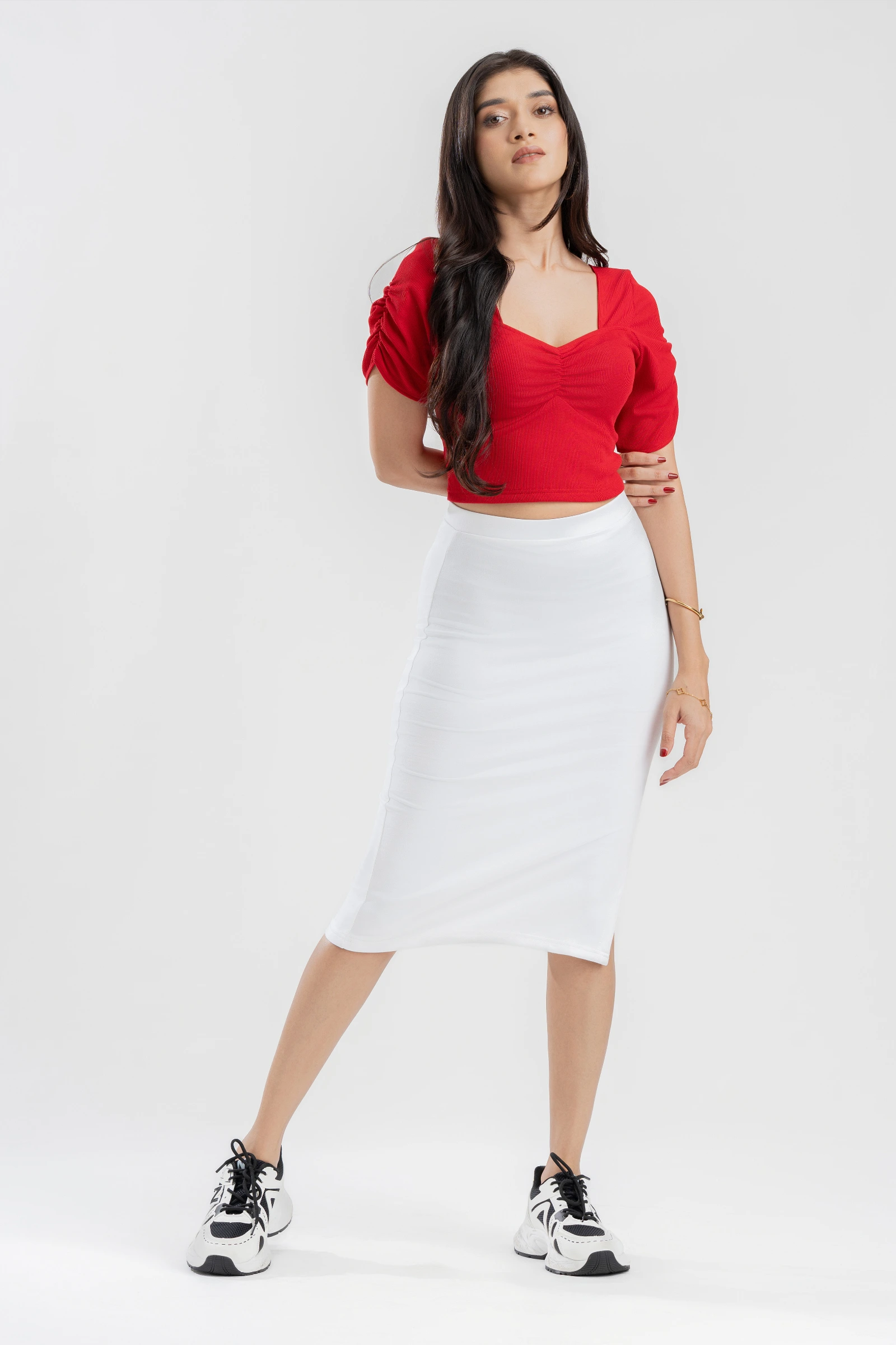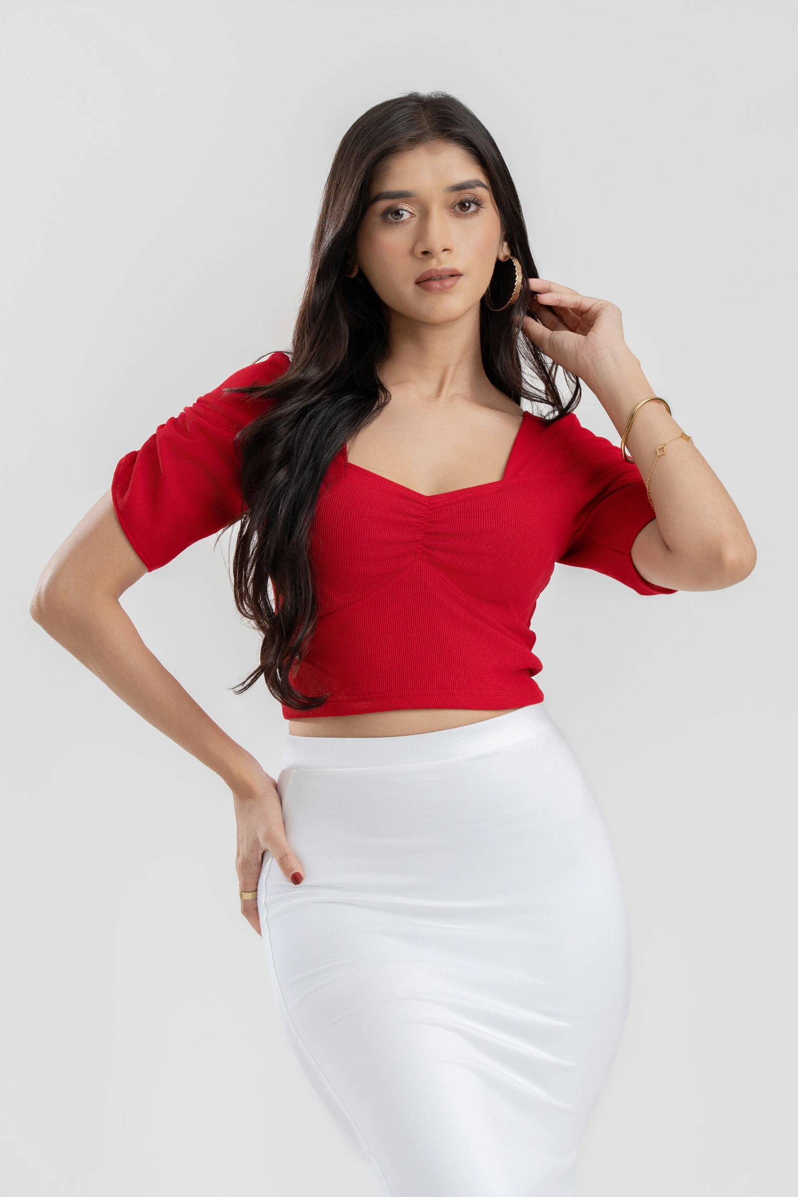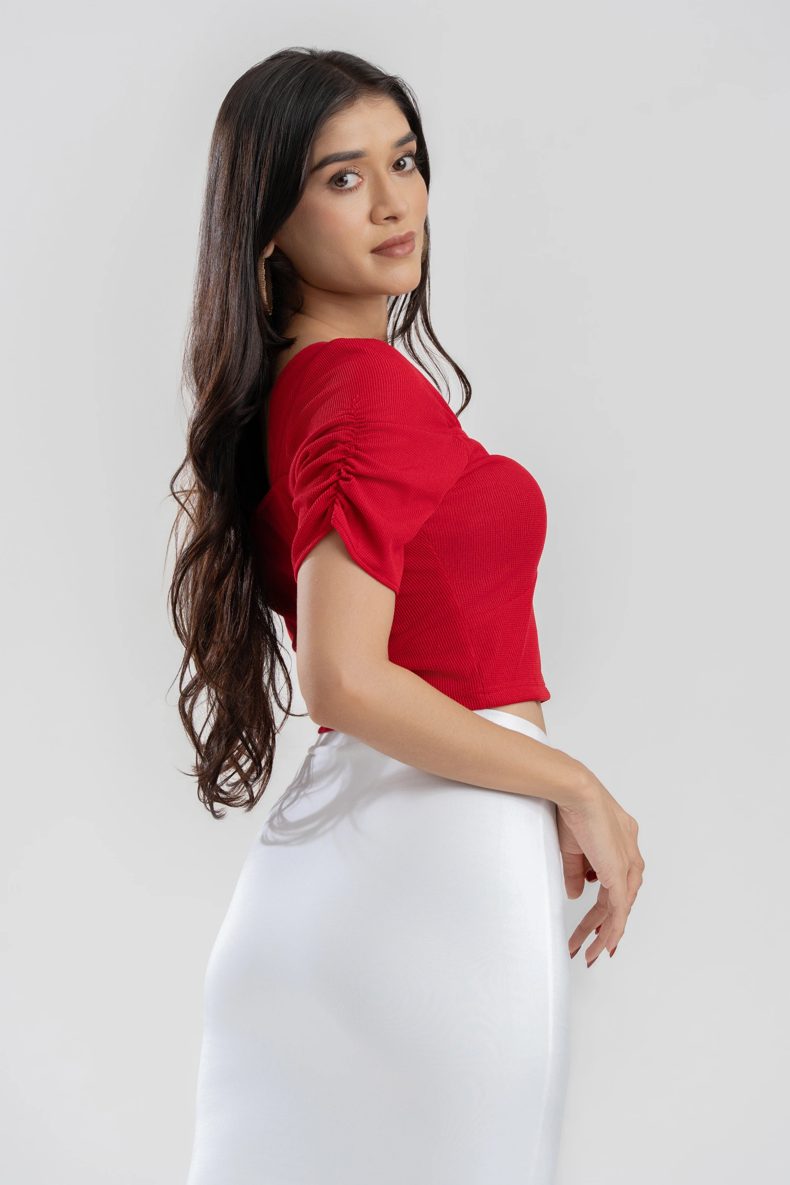This Tee Love crop top in a vibrant red features chic gathered sleeves for a touch of sophisticated ...