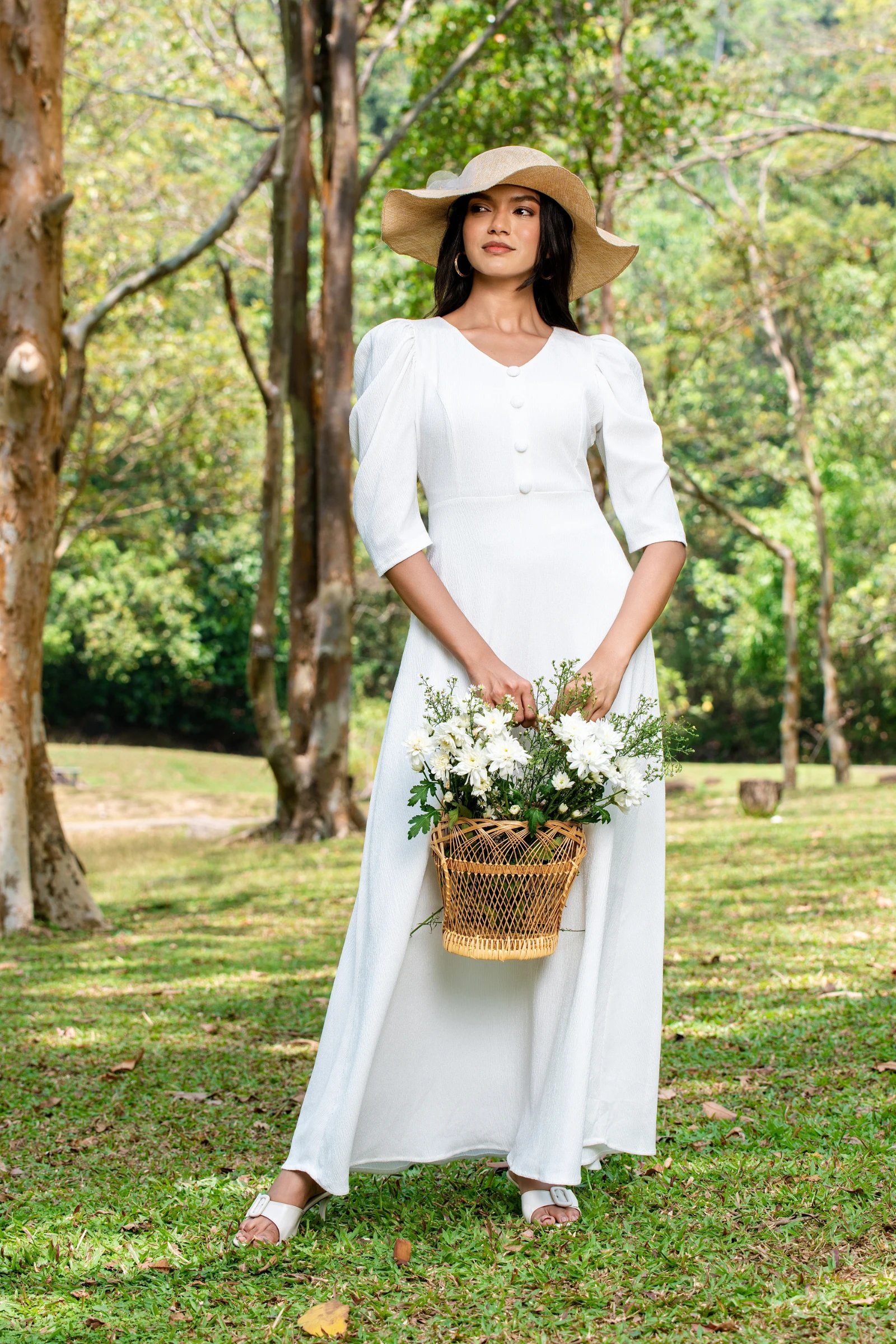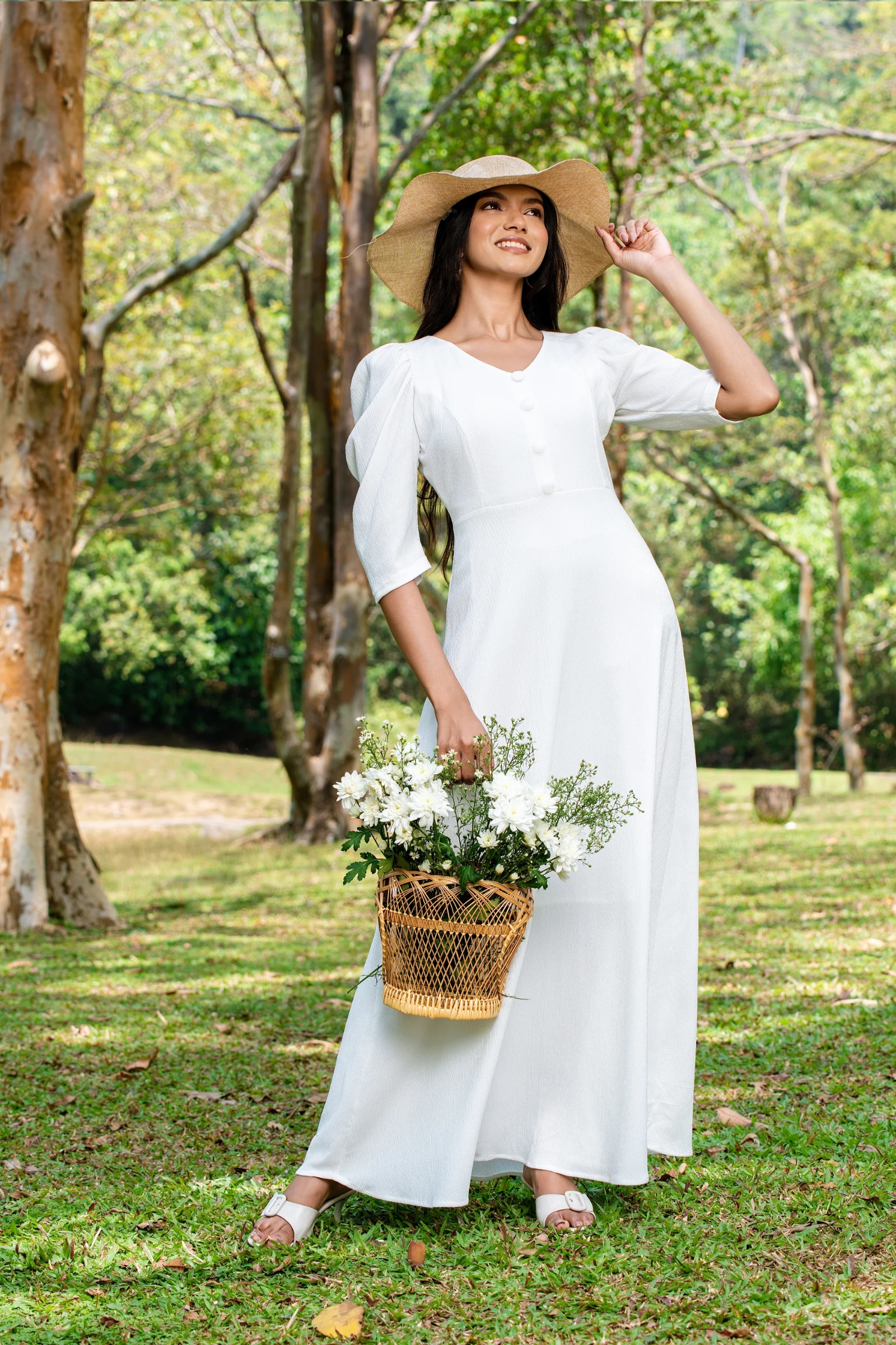 Embrace effortless elegance with the Tee Love White Color Front Button LINE Puff Sleeve Long Dress. ...