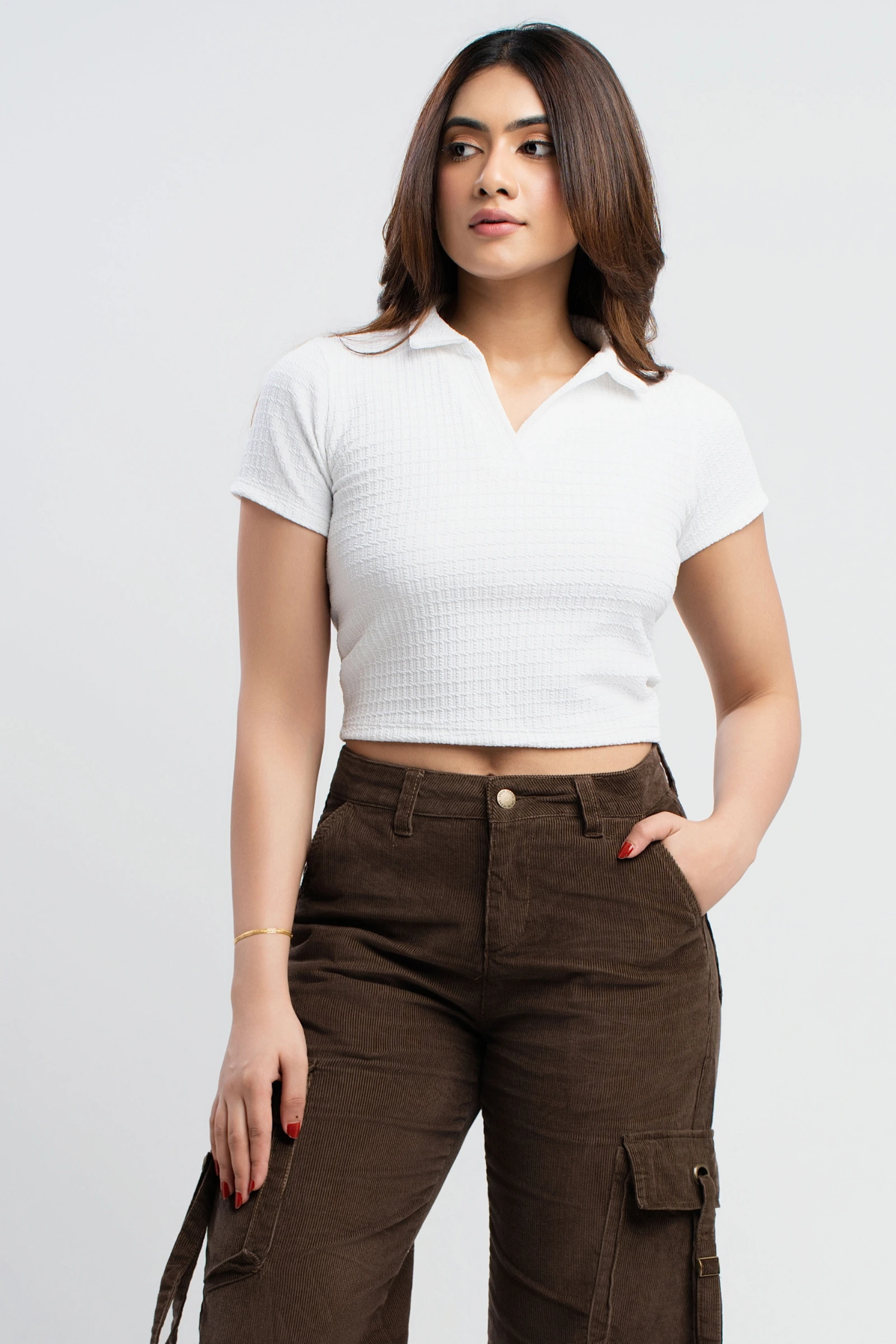 The Tee Love White Polo Collar Crop Top is a chic and versatile addition to your wardrobe. Crafted f...