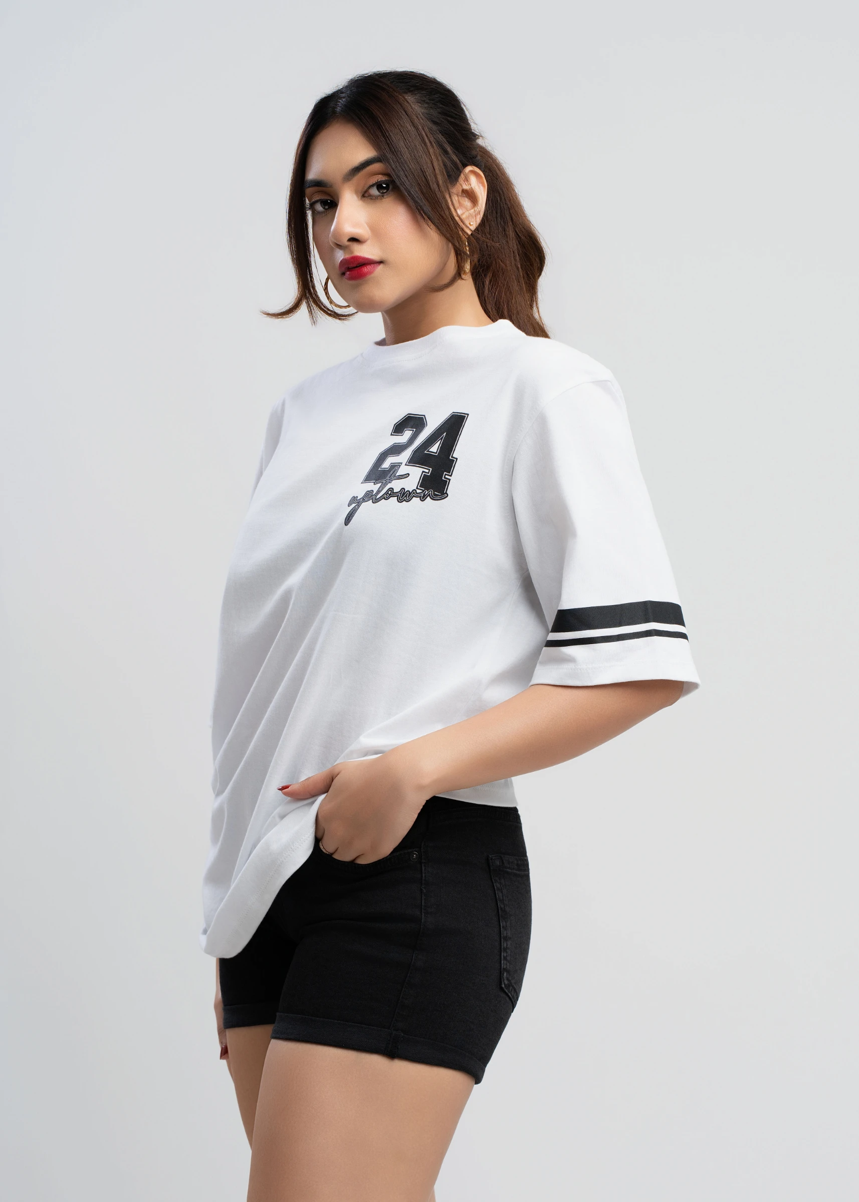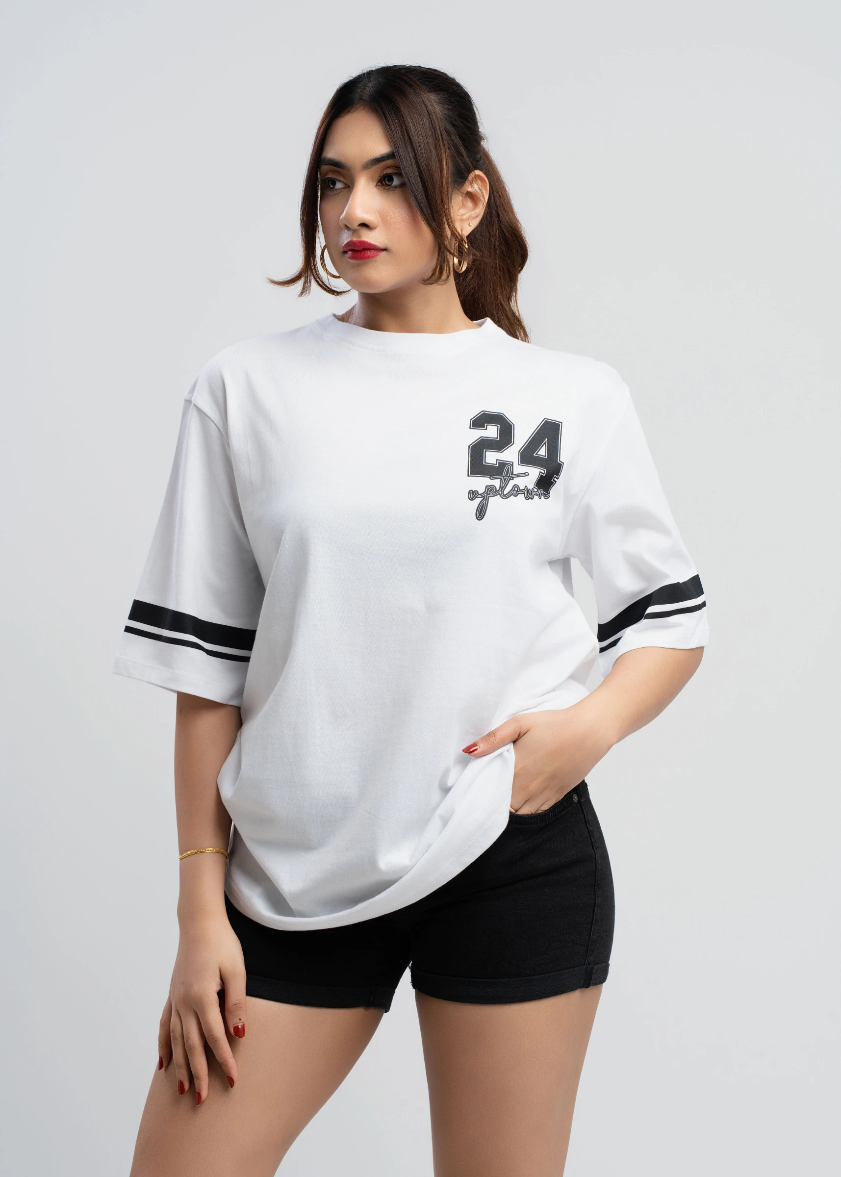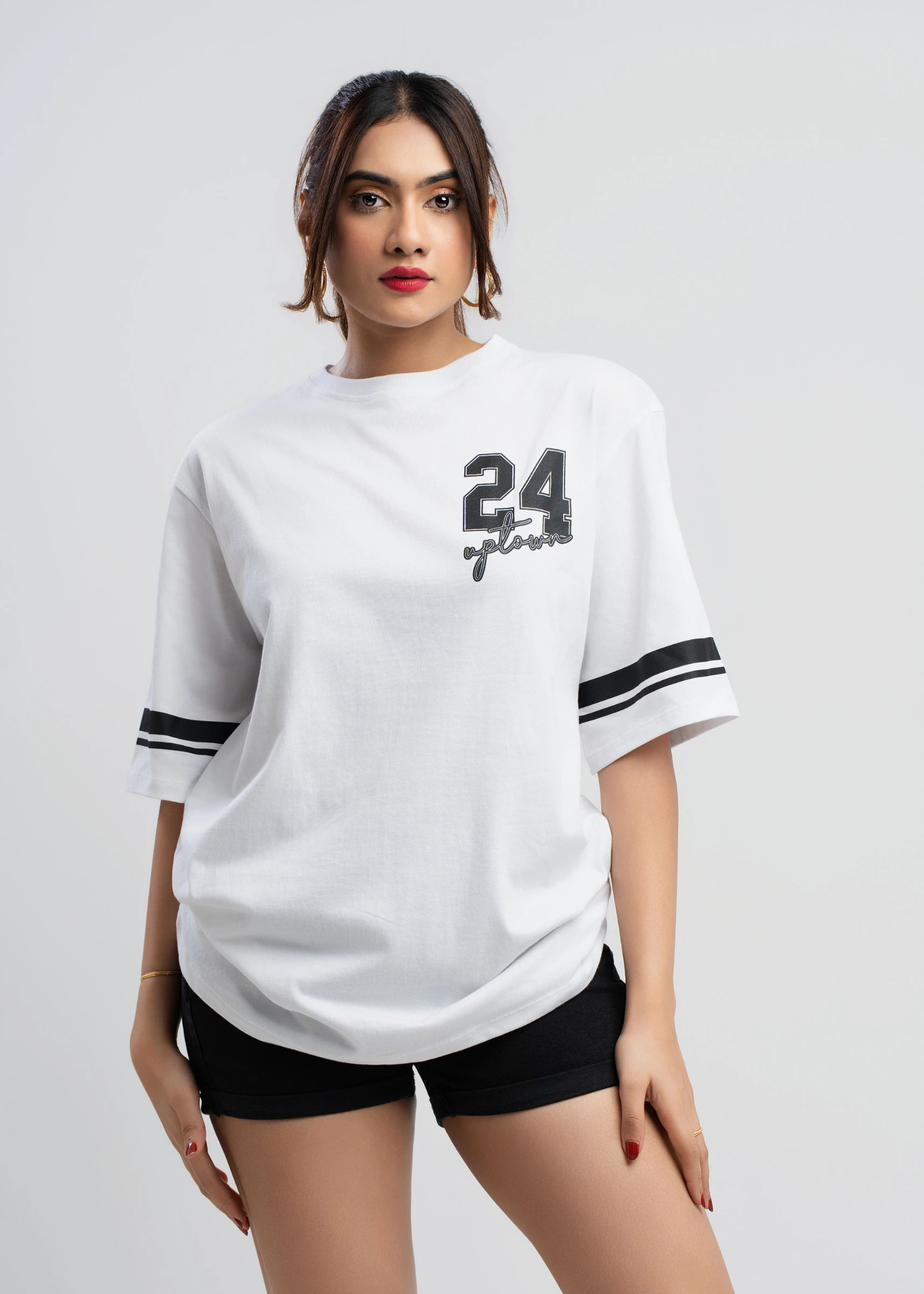 Elevate your casual wardrobe with the Uptown 24 Black & White Oversized T-Shirt. This effortlessly c...