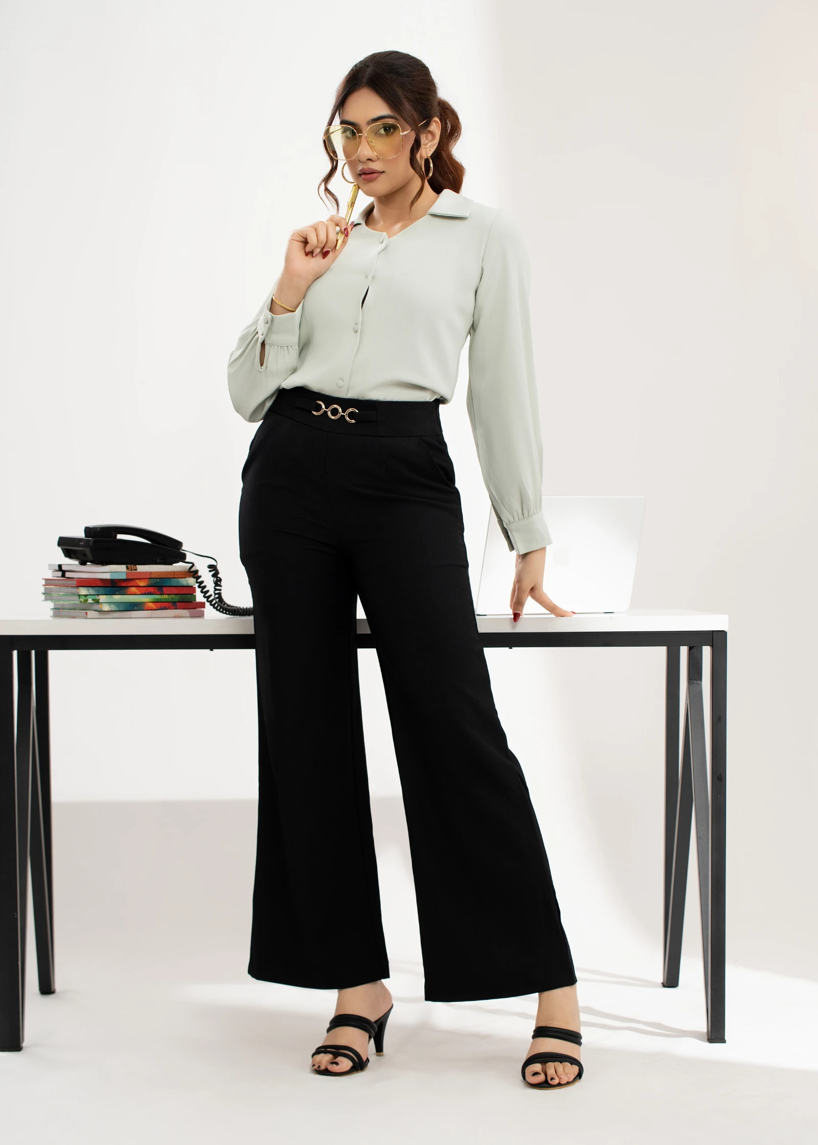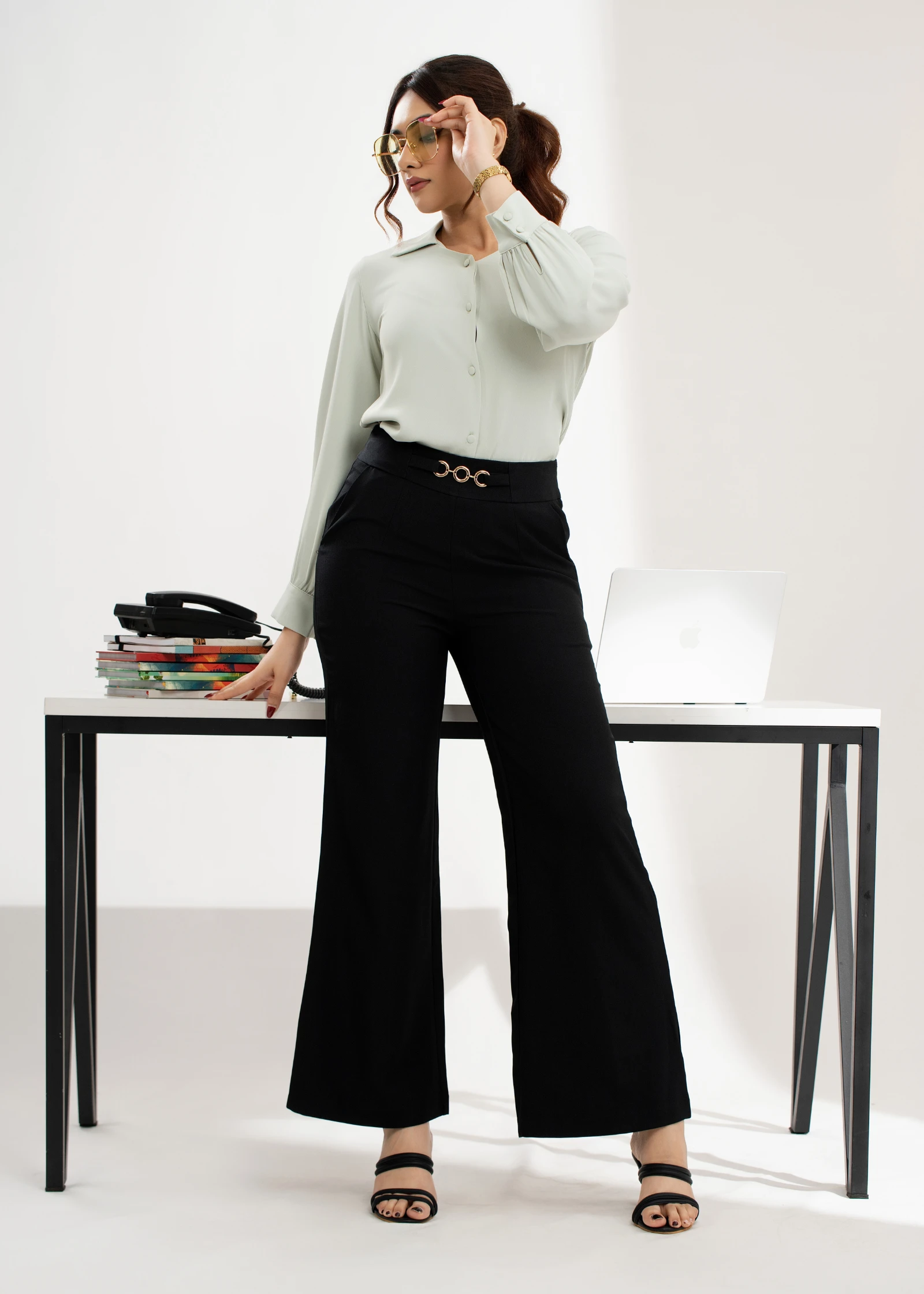 Introducing the Uptown Black Buckle Detail Flare Pant. These stylish trousers feature a flattering f...