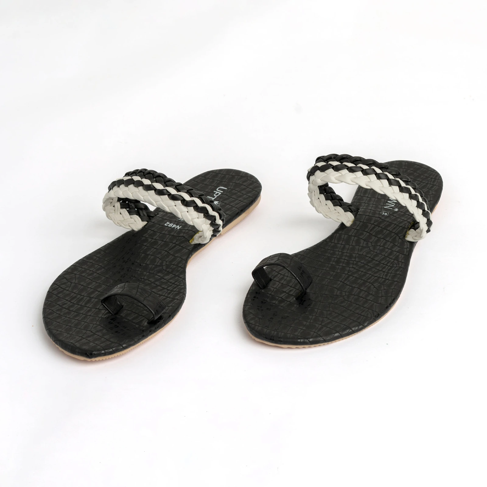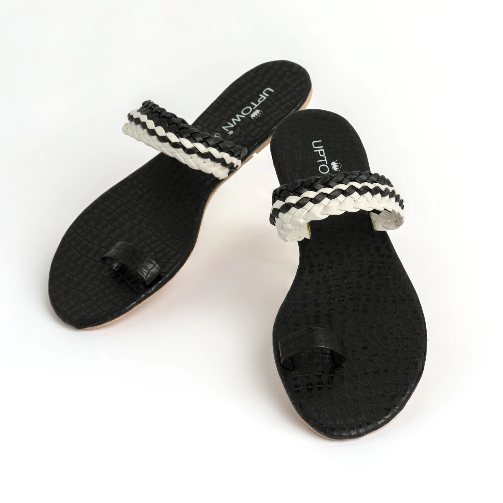 Step out in sophisticated style with the Uptown Braided Ring-Toe Black Sandal. These chic sandals fe...