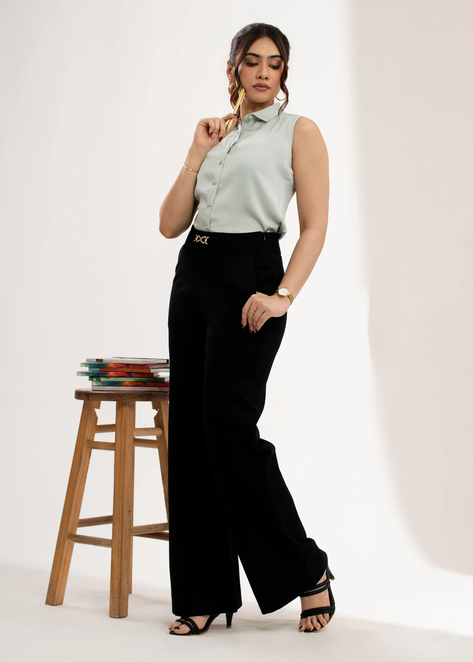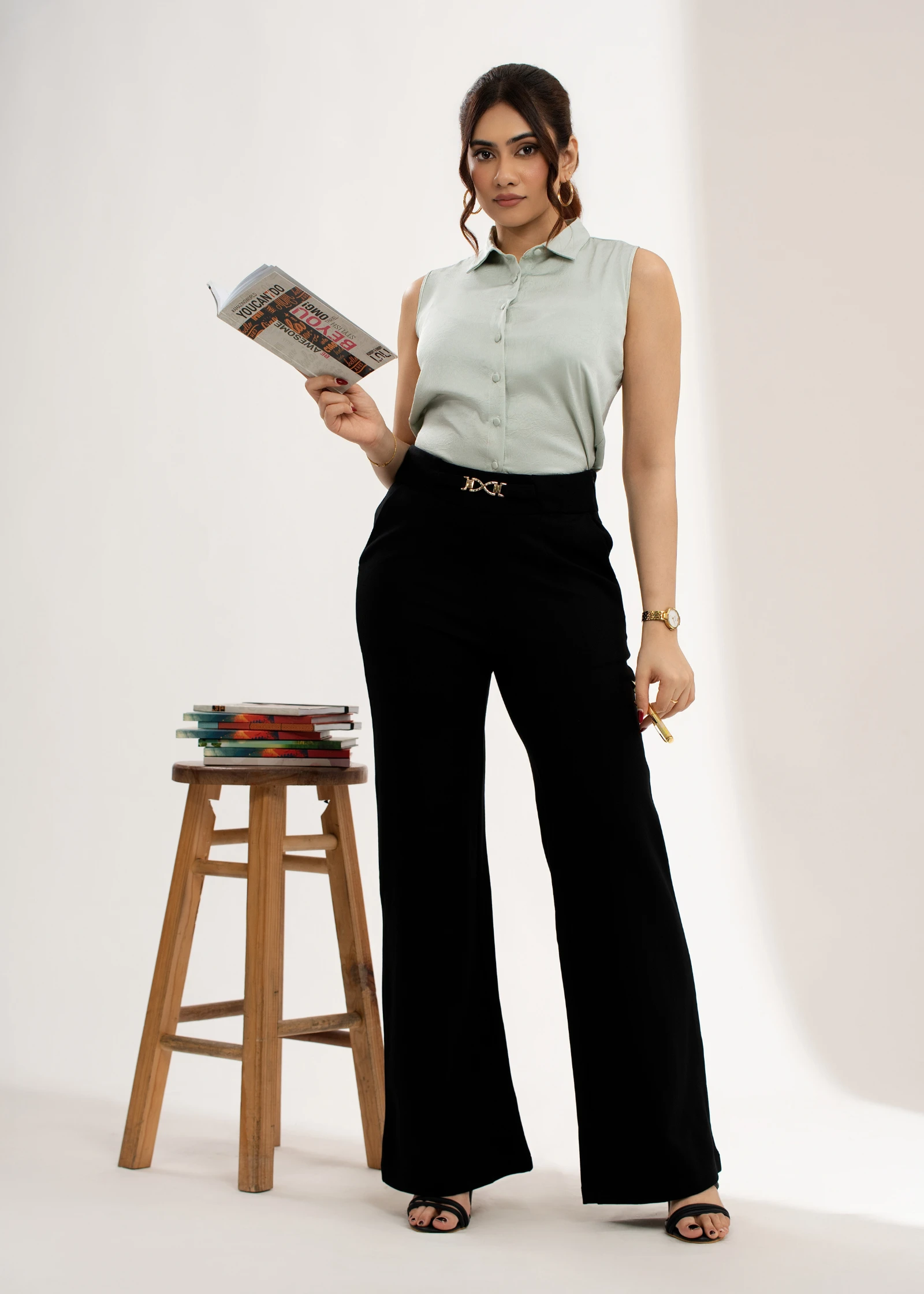 Elevate your style with the Uptown Buckle Detail Flare Pant. These chic trousers feature a flatterin...