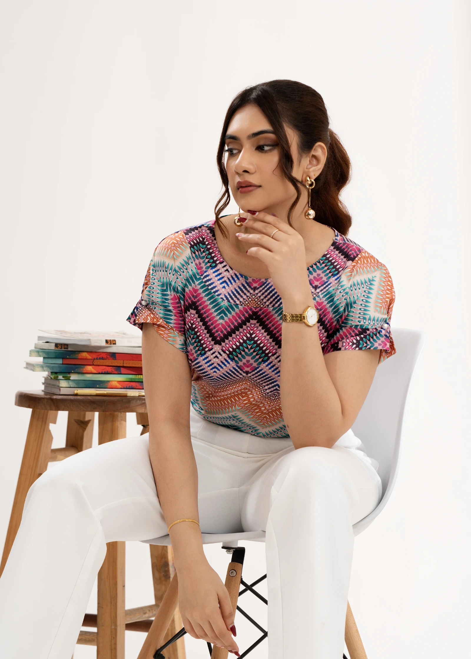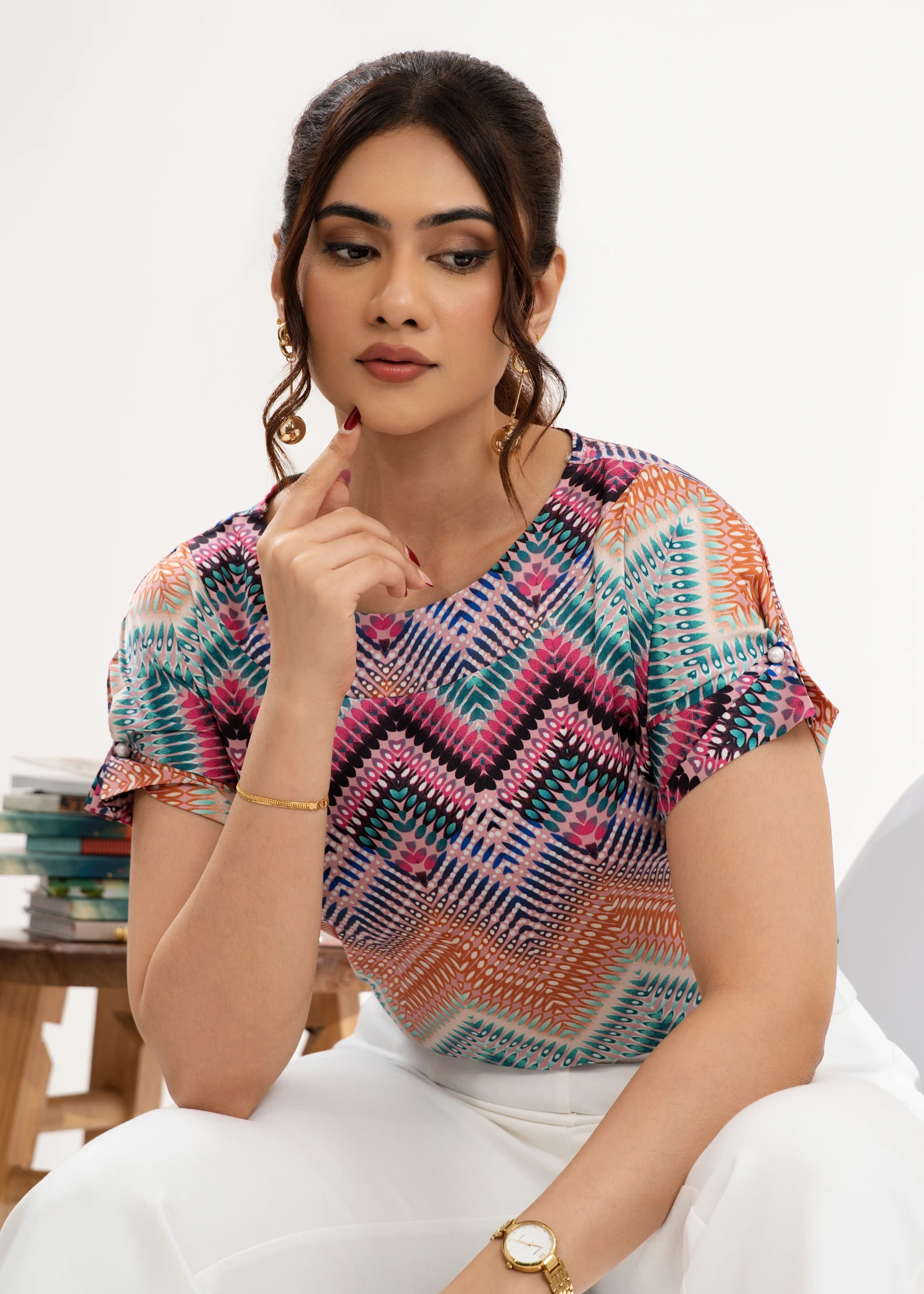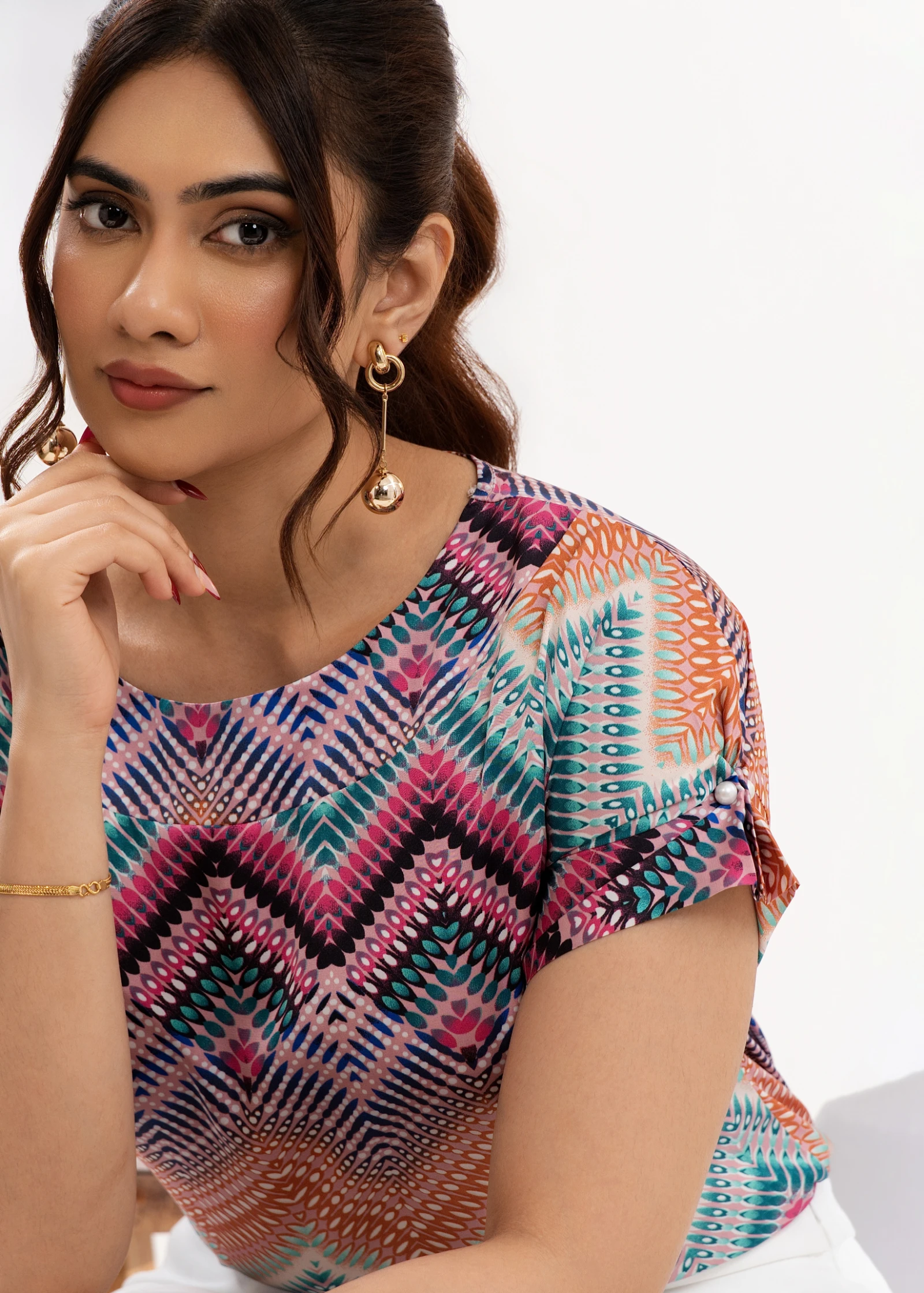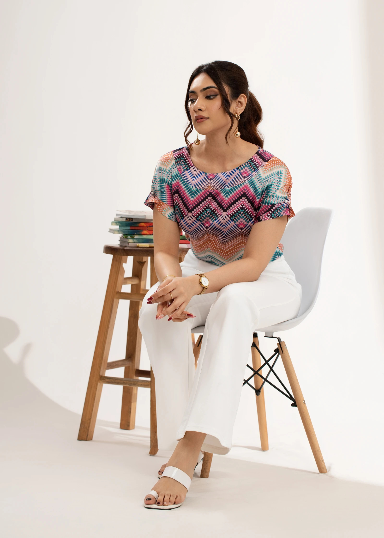 Effortless style meets modern chic with the Uptown Chevron Print Round Neckline Top. Featuring a sop...