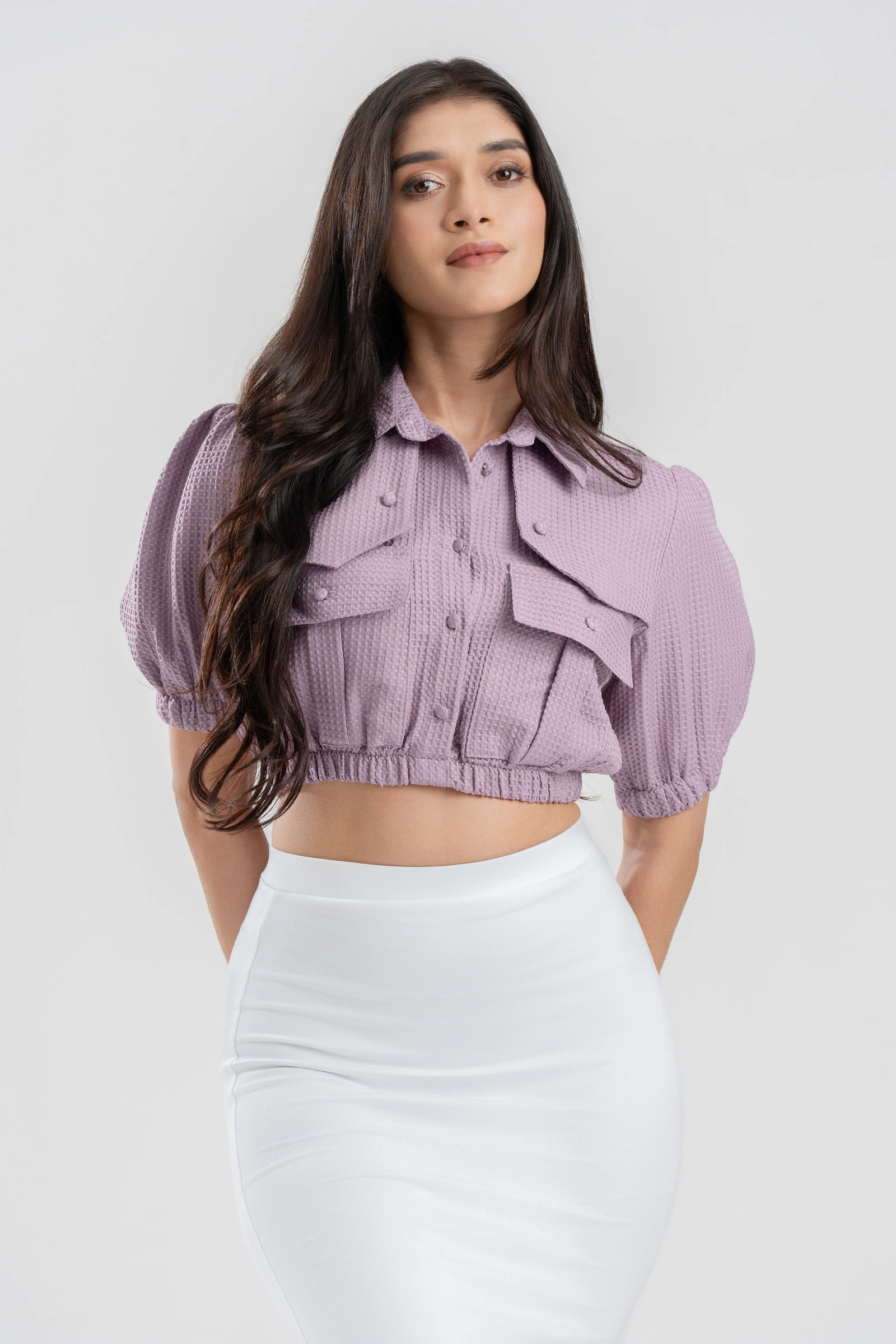 Effortlessly chic, the Uptown Front Double Pocket Gathered Sleeve Crop Top is your new go-to. This s...