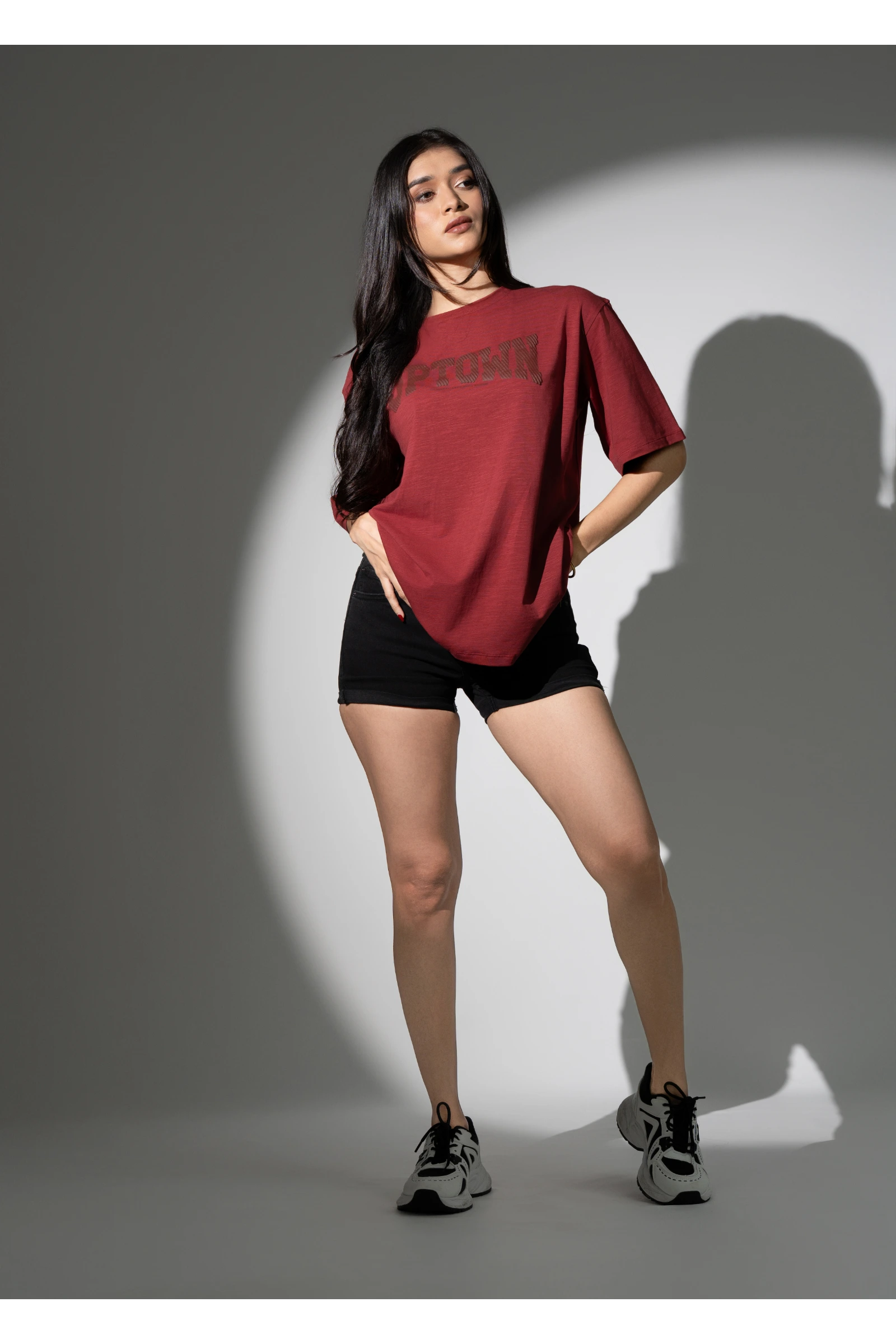 Experience effortless style with the Uptown Front Print Maroon Oversized T-shirt. Crafted for ultima...