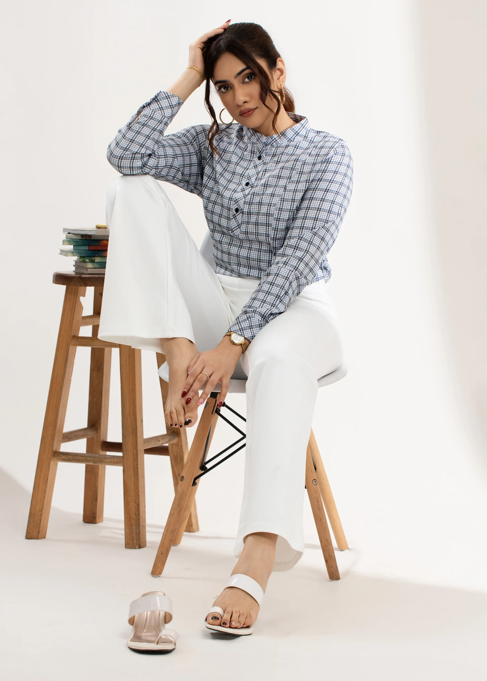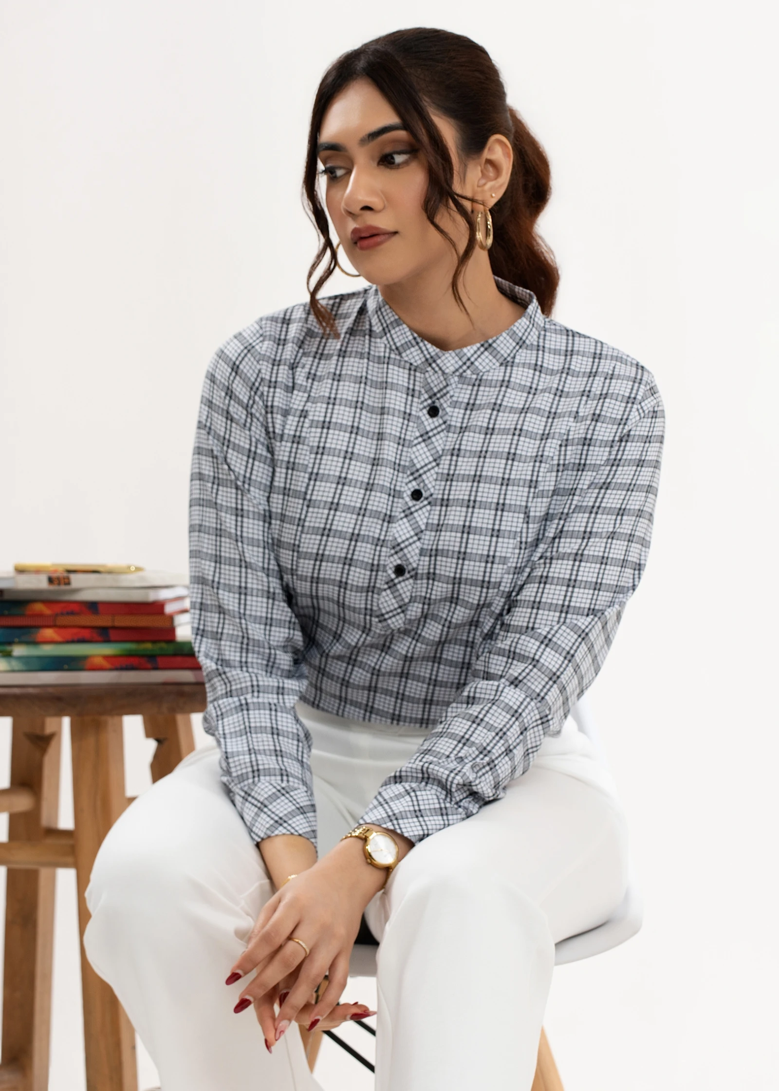 Elevate your everyday style with the Uptown Mandarin Collar Checkered Top. This chic top features a ...