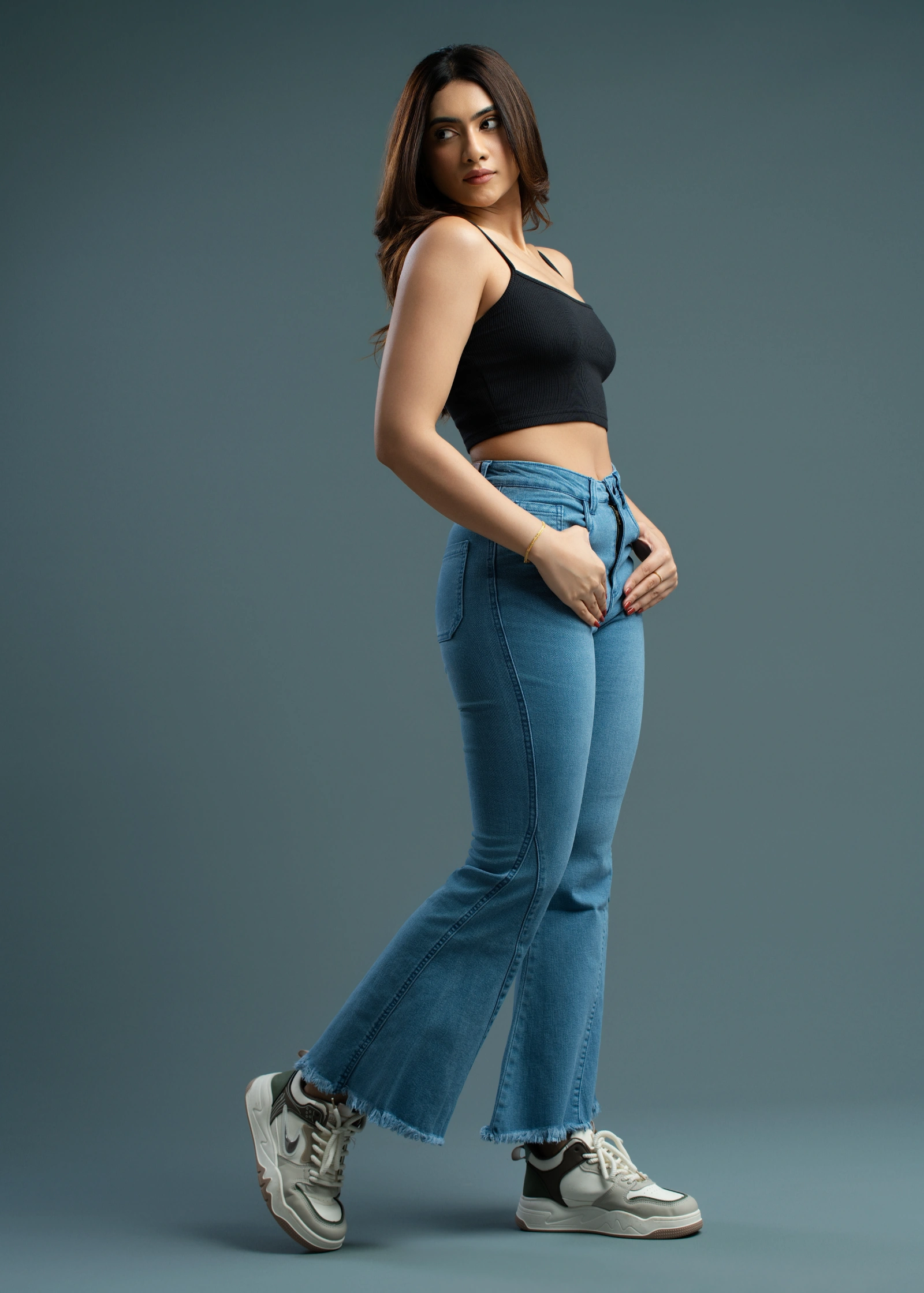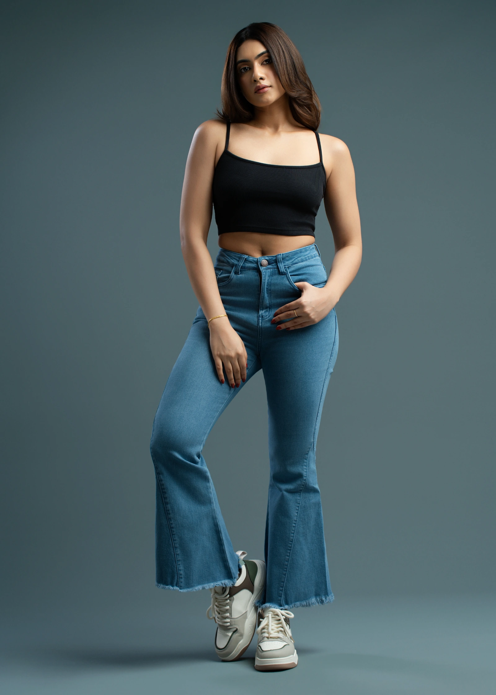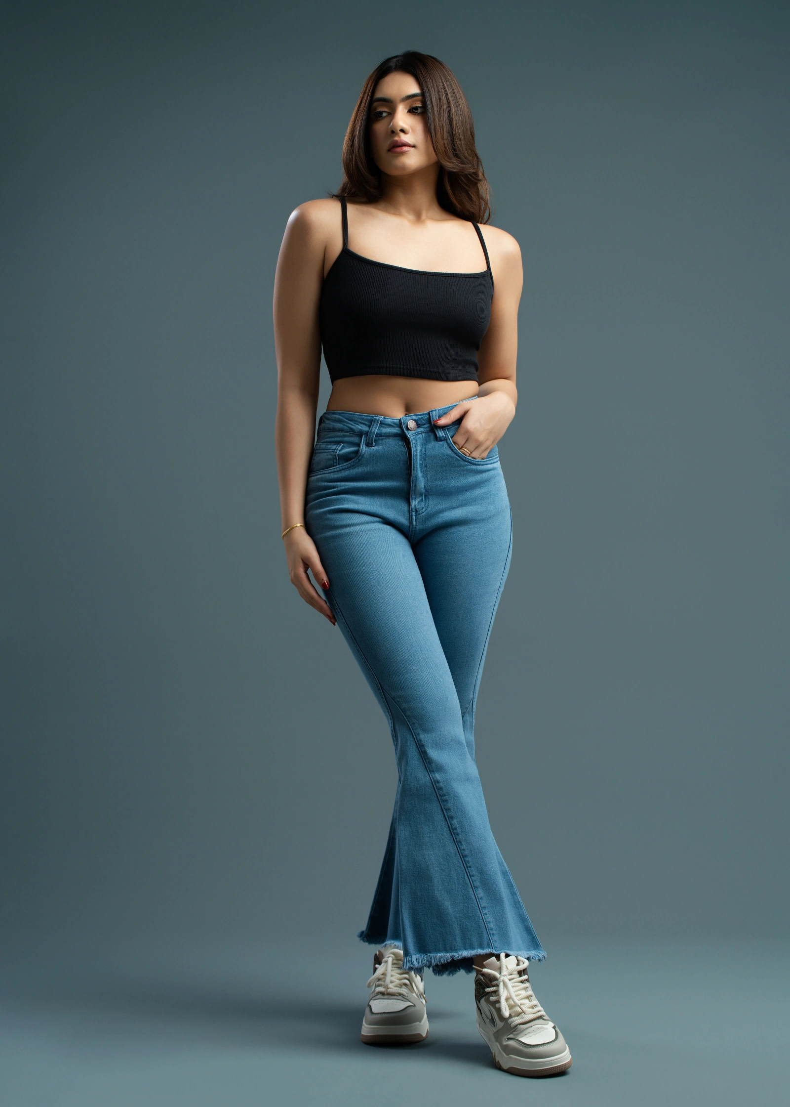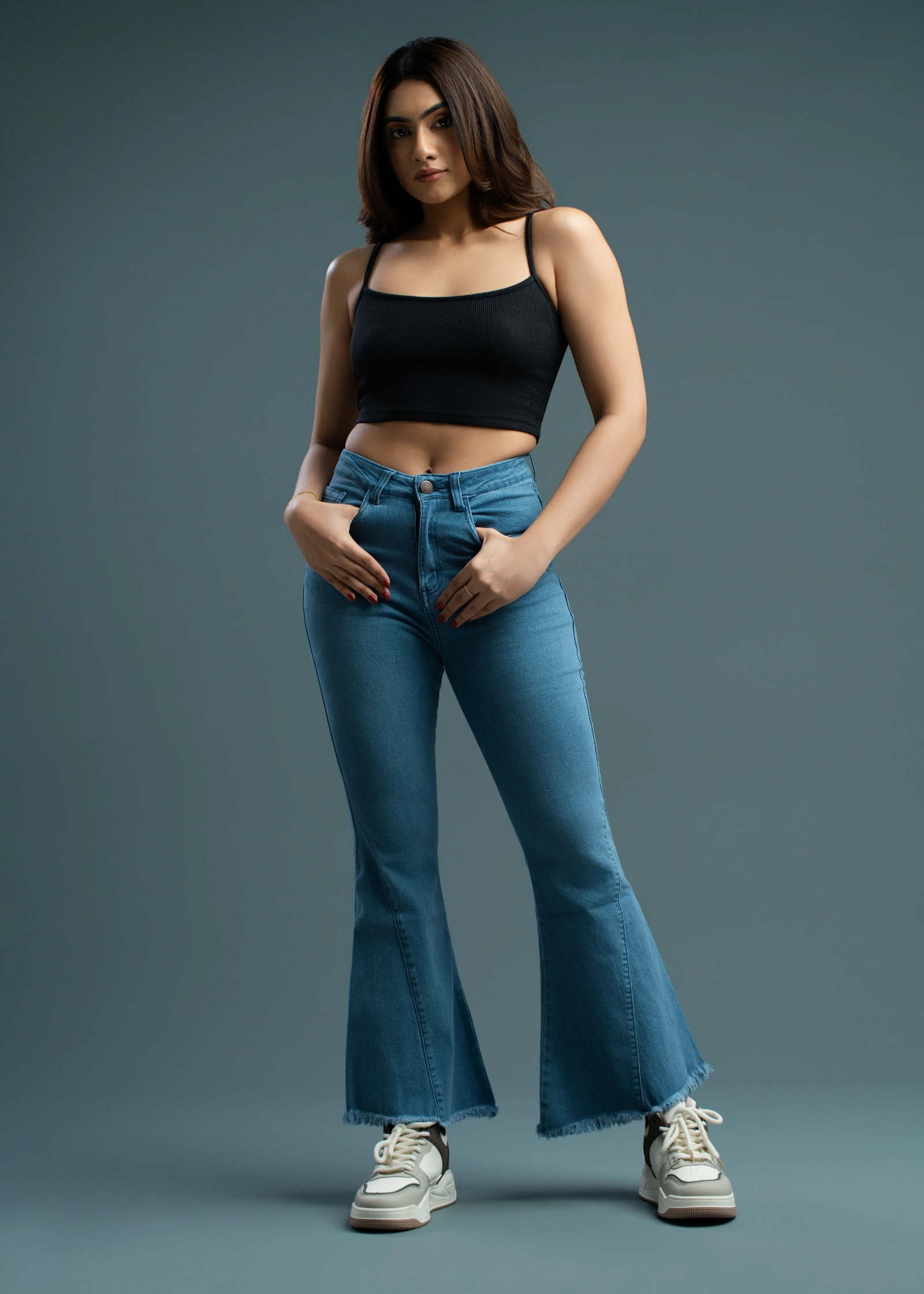 The Uptown One Button Bell Bottom Jean offers a chic, retro-inspired silhouette with a modern twist....
