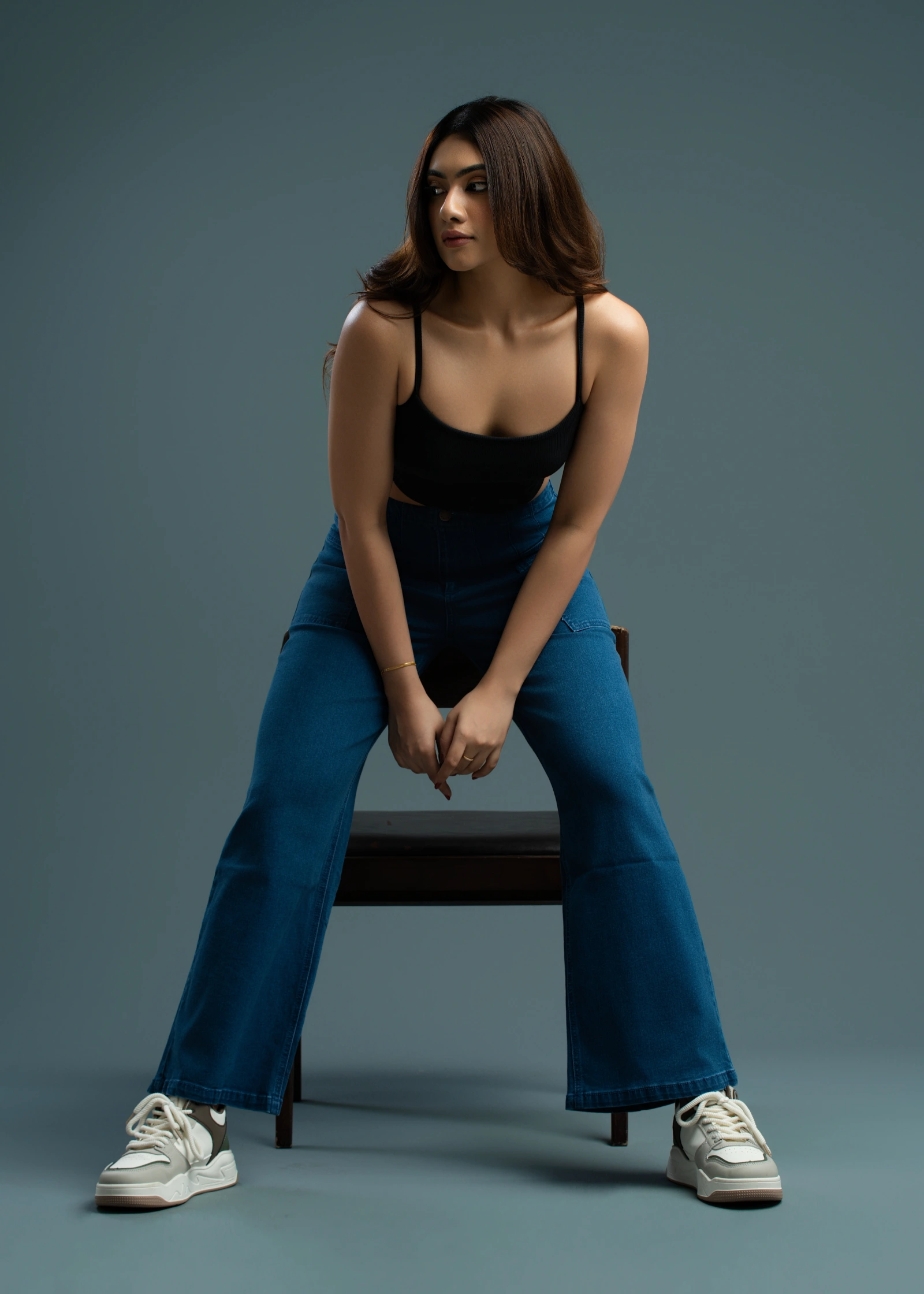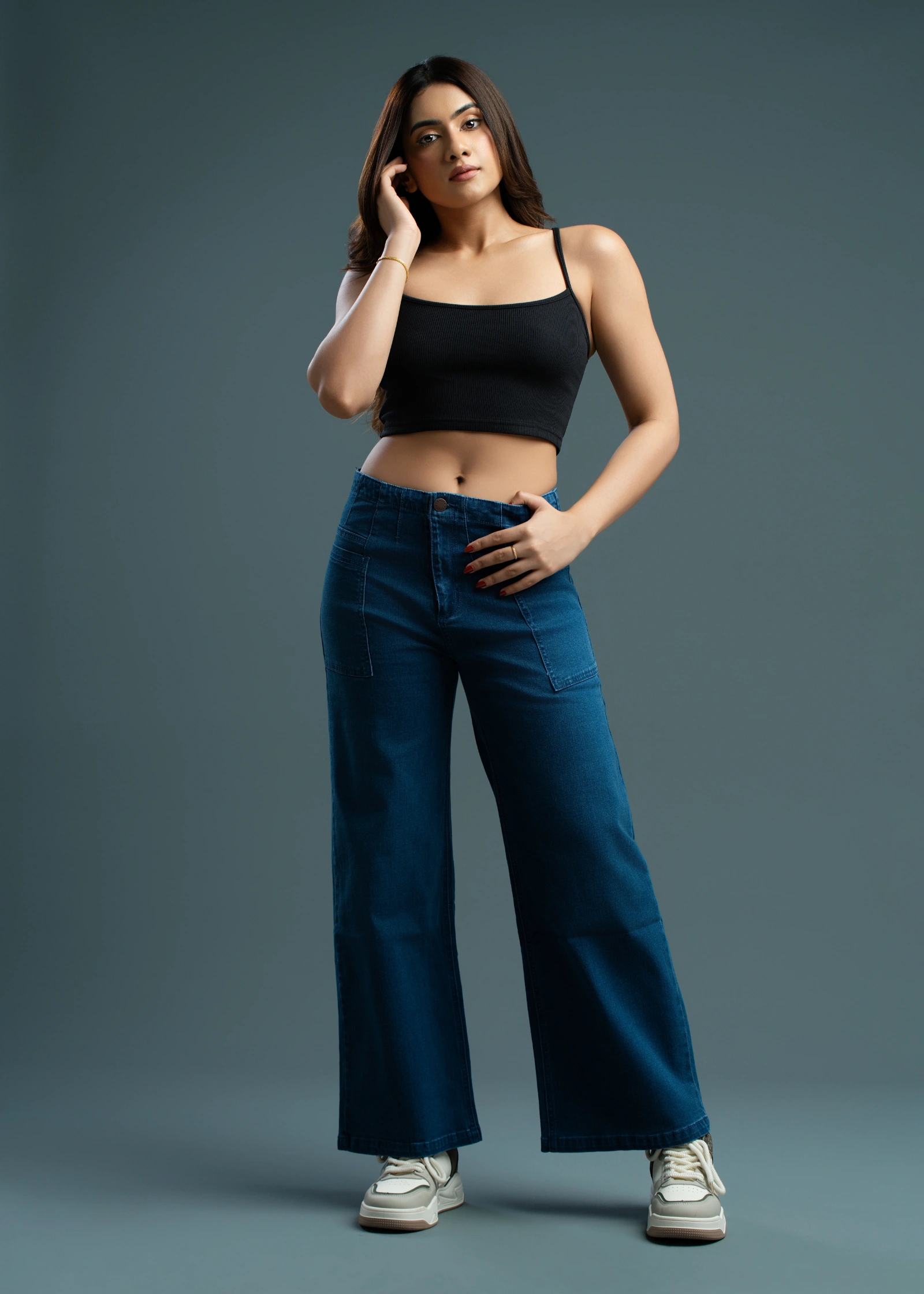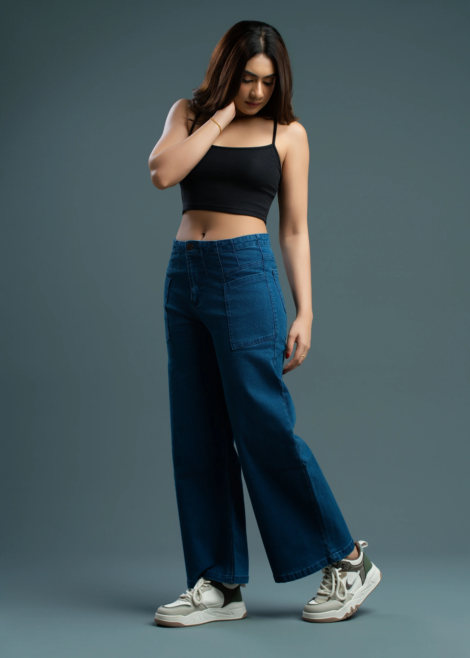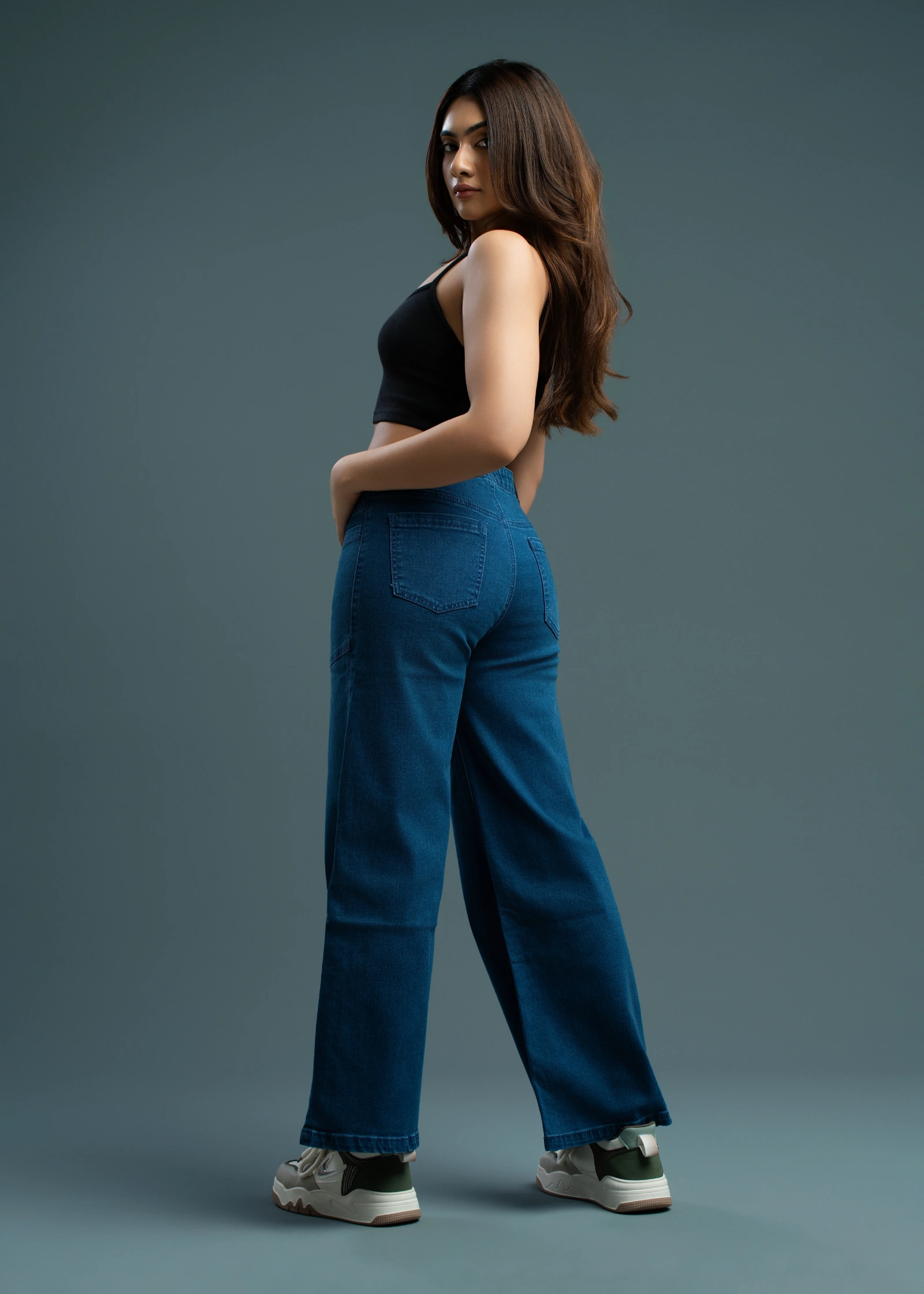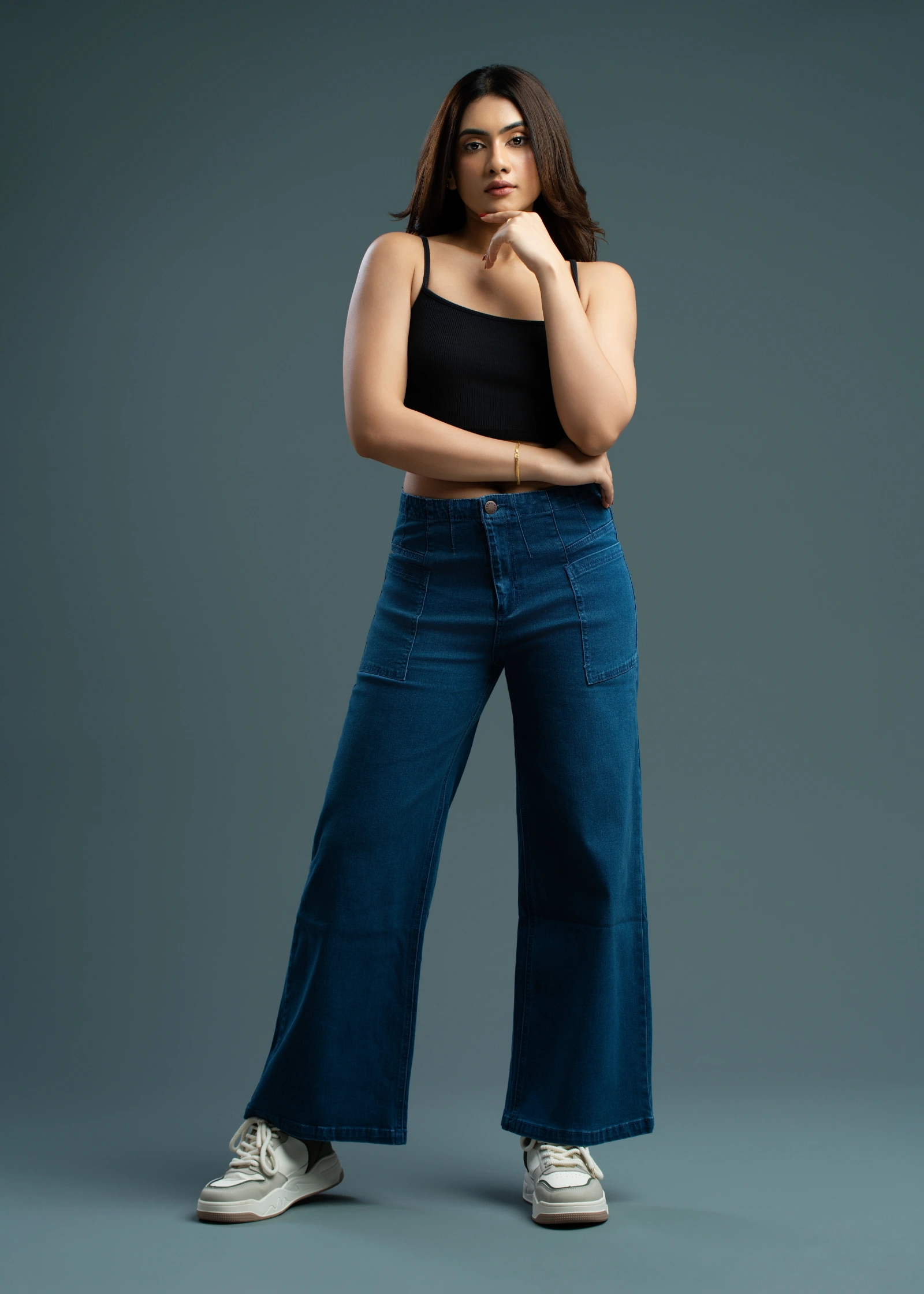 The Uptown One Button Wide-Leg Jean offers a modern silhouette with a flattering high waist and a si...