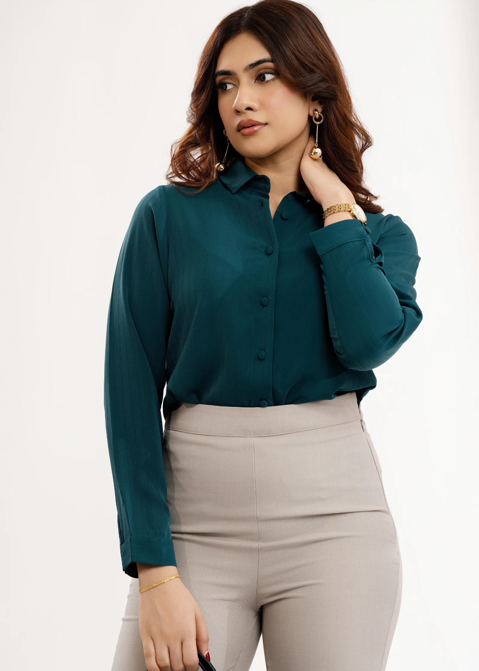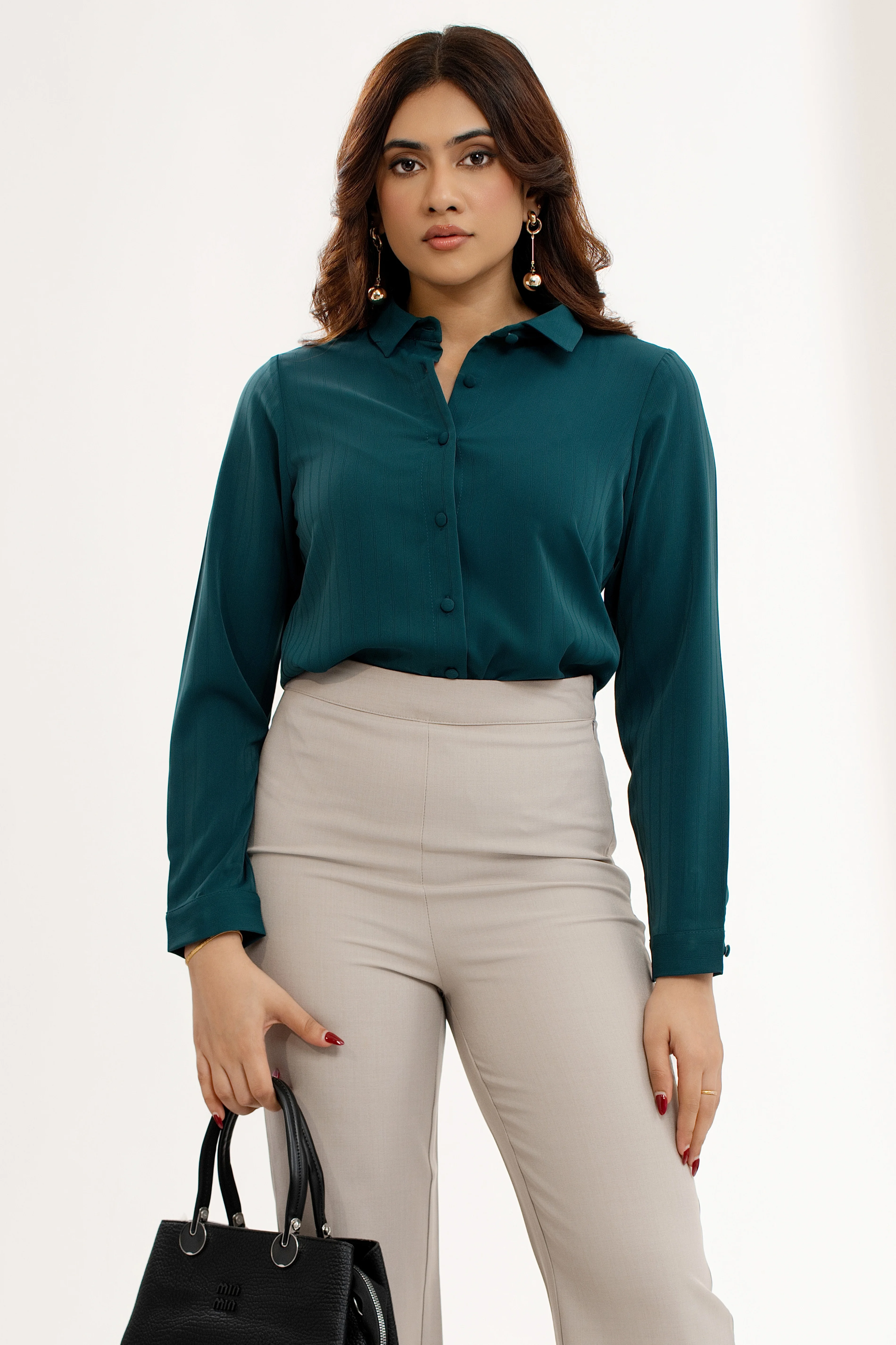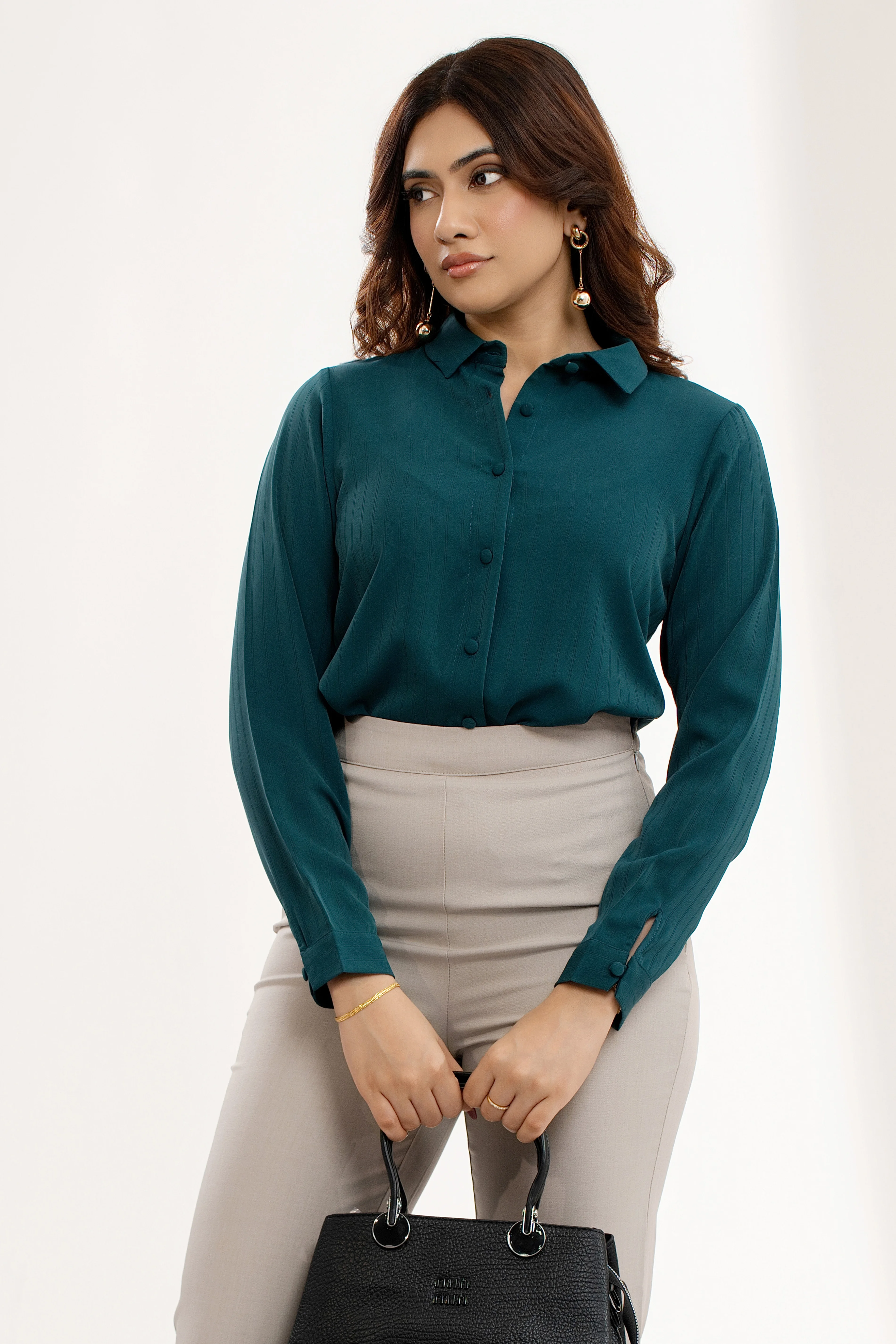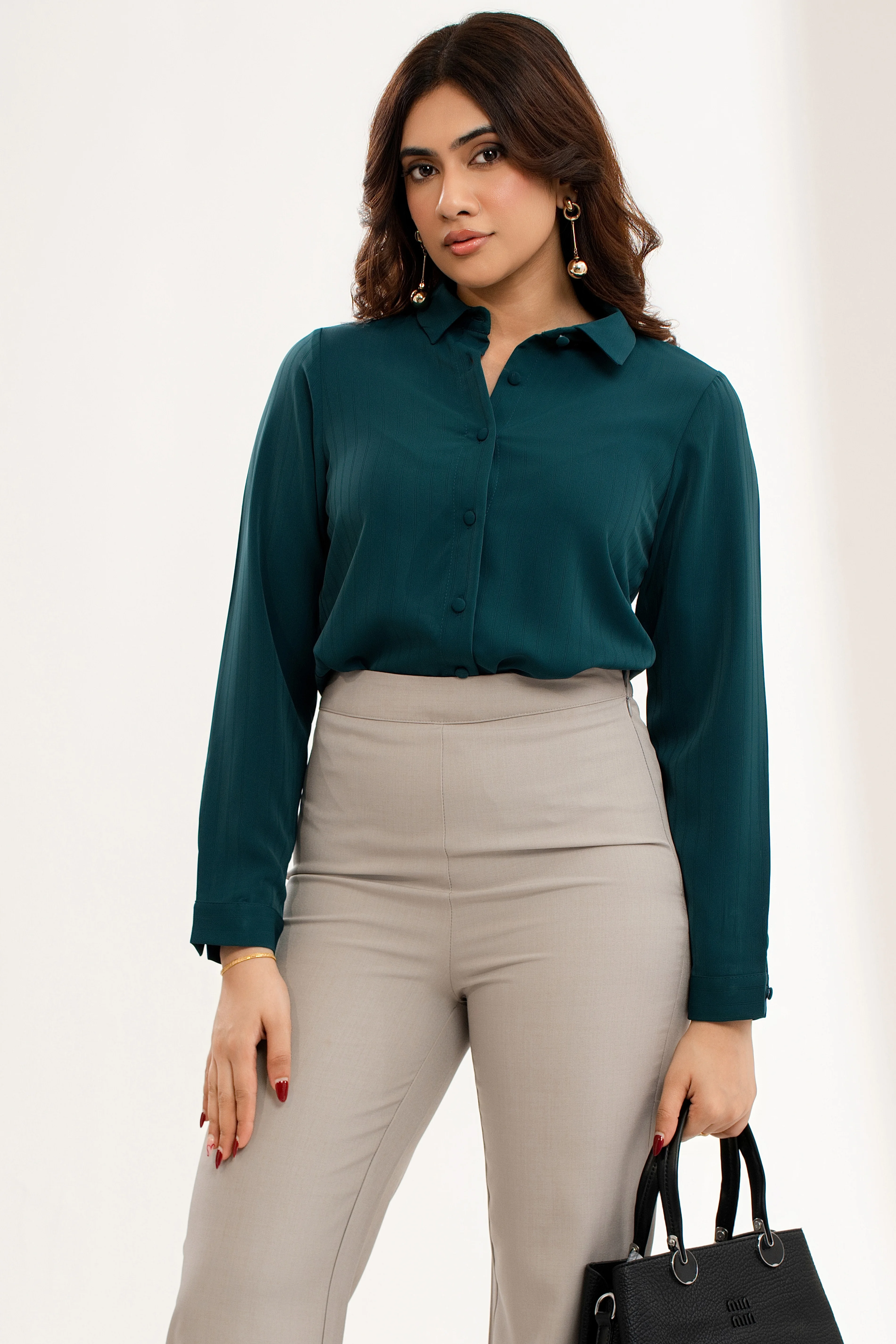 Effortlessly chic, the Uptown Teal Green Button-Up Collared Top is your new go-to for polished style...