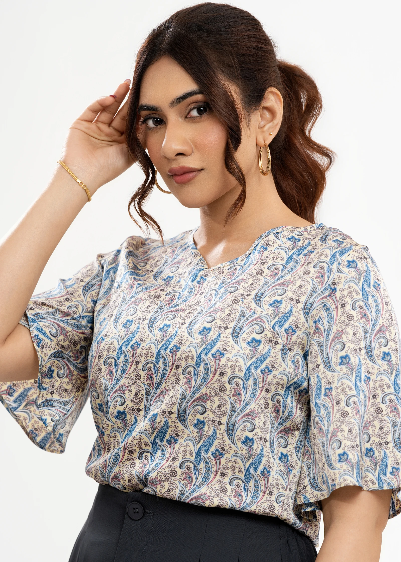 Elevate your everyday style with the Uptown V-neck Paisley Print Top. This chic top features a flatt...
