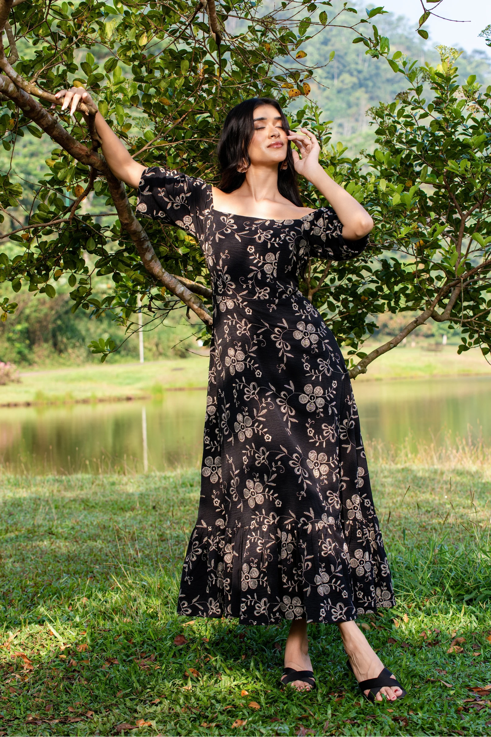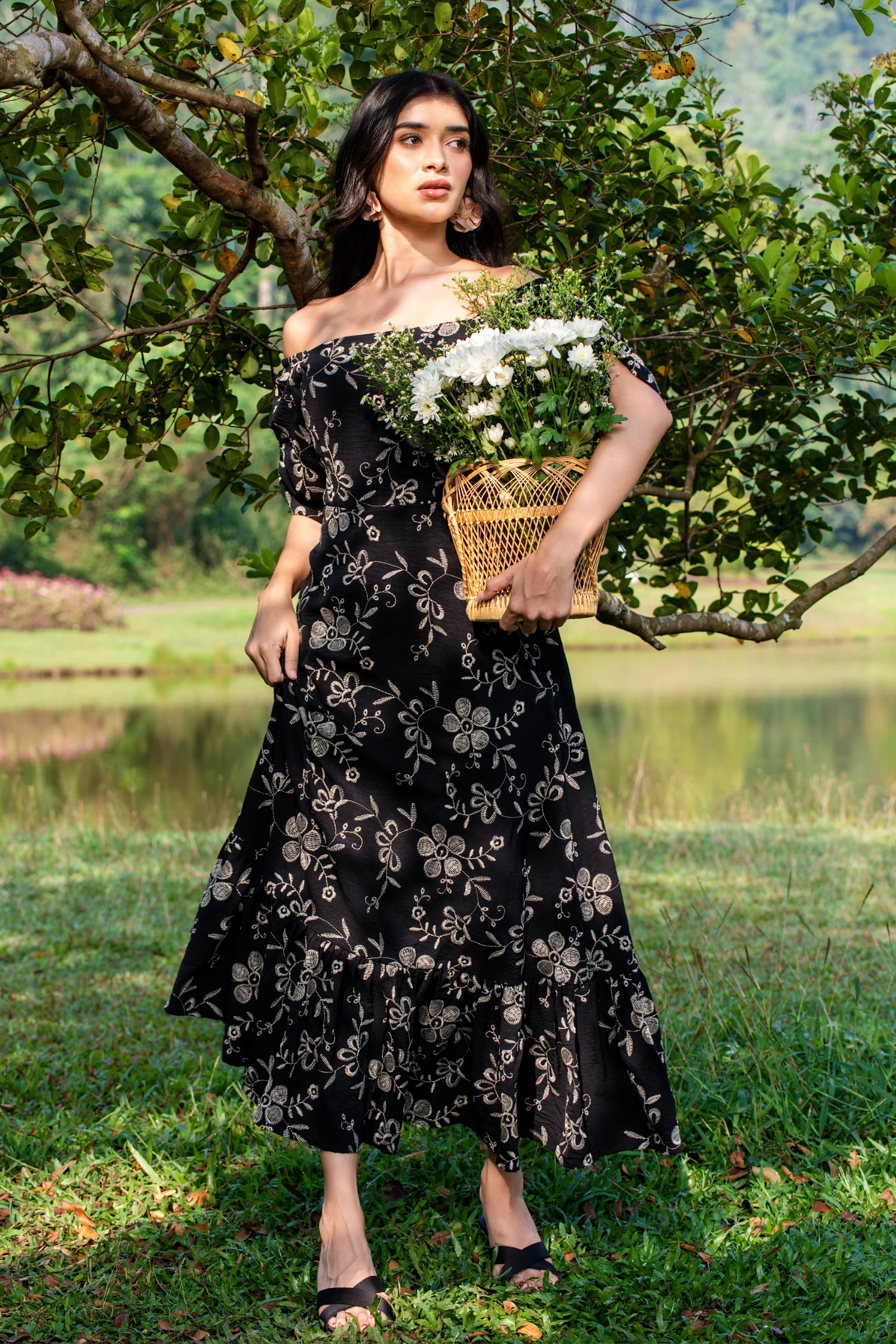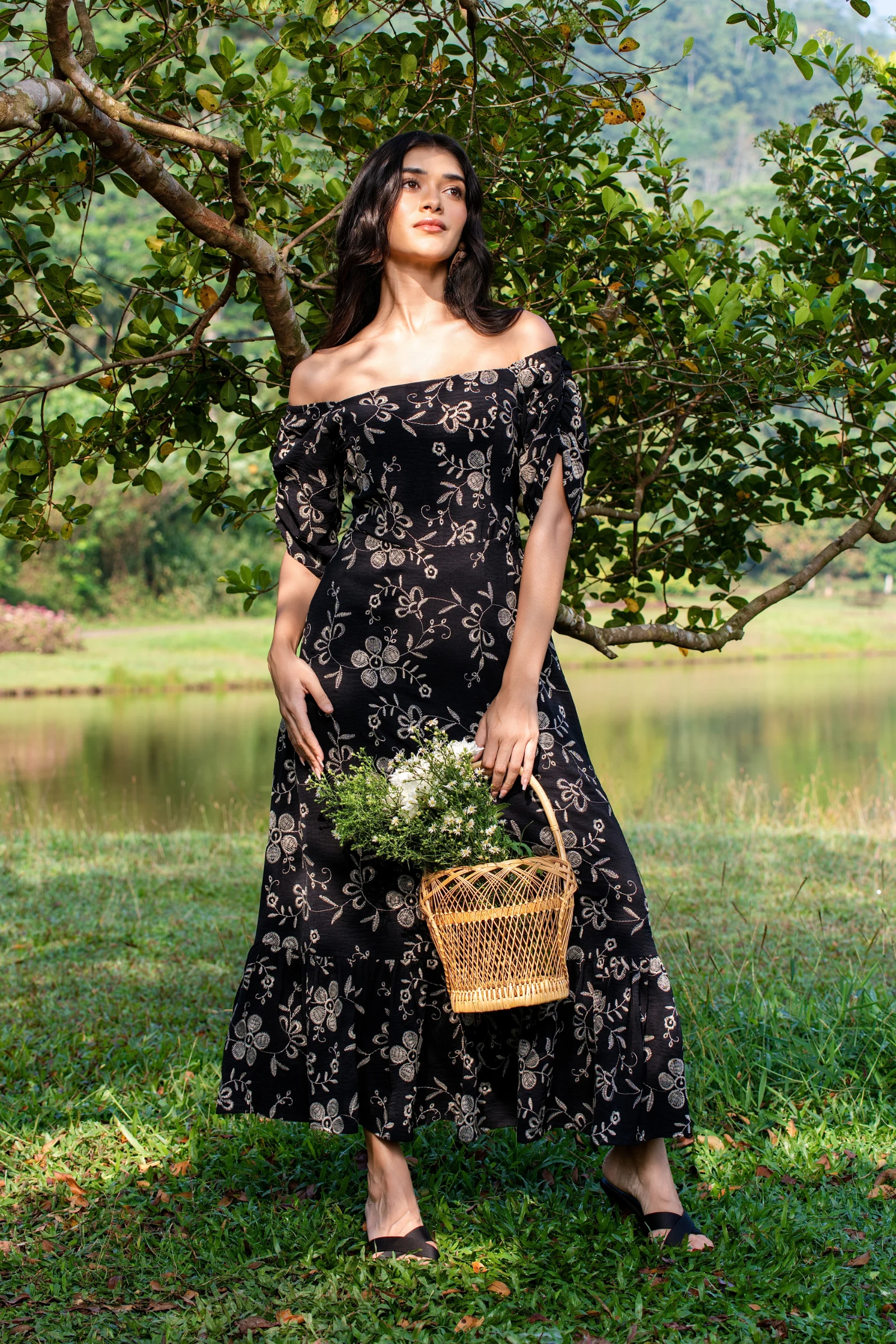 Embrace effortless chic with our Tee Love Black Color Printed Off Shoulder Long Dress. This flowing ...