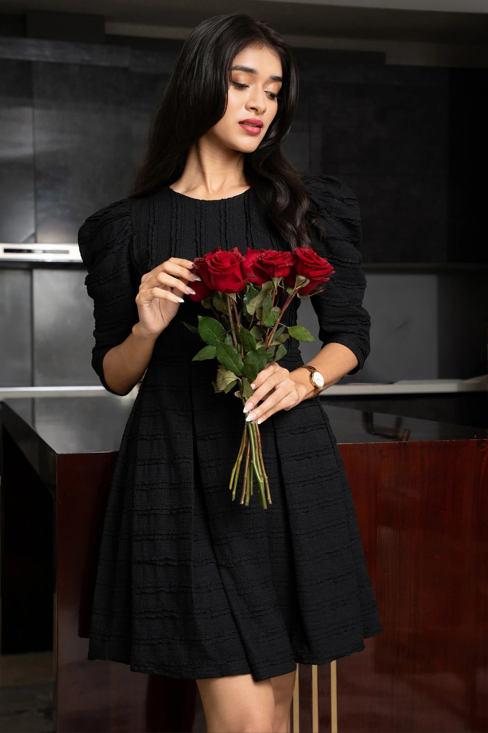 Effortless style meets modern texture with the Tee Love Black Textured Fit-and-Flare Dress. This chi...