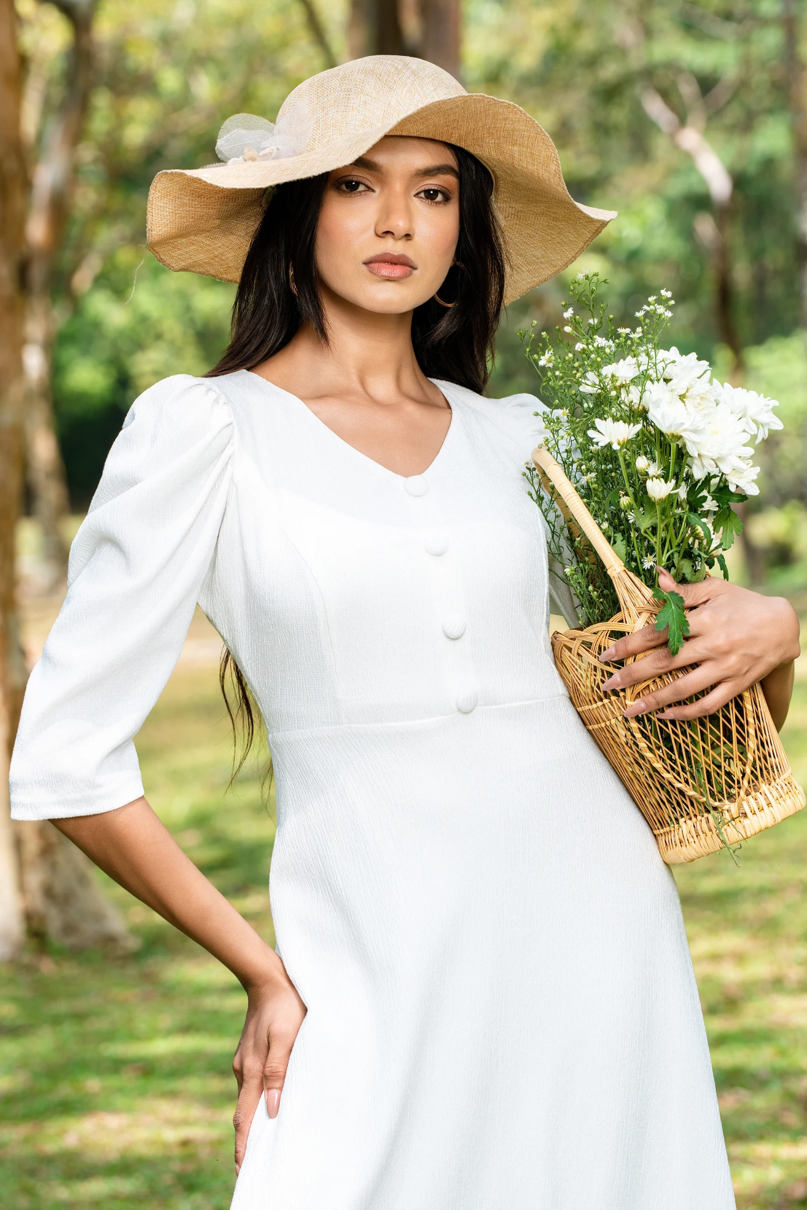 Embrace effortless elegance with the Tee Love White Color Front Button LINE Puff Sleeve Long Dress. ...