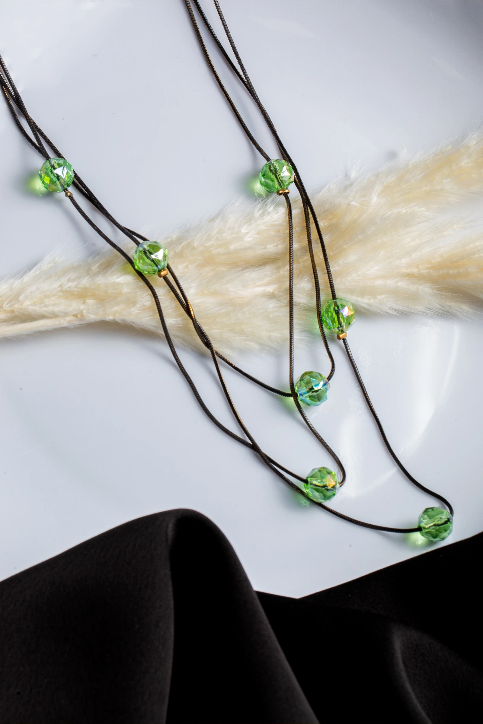 Elegant three-layered chain necklace featuring shimmering green crystal beads. A sophisticated stat...