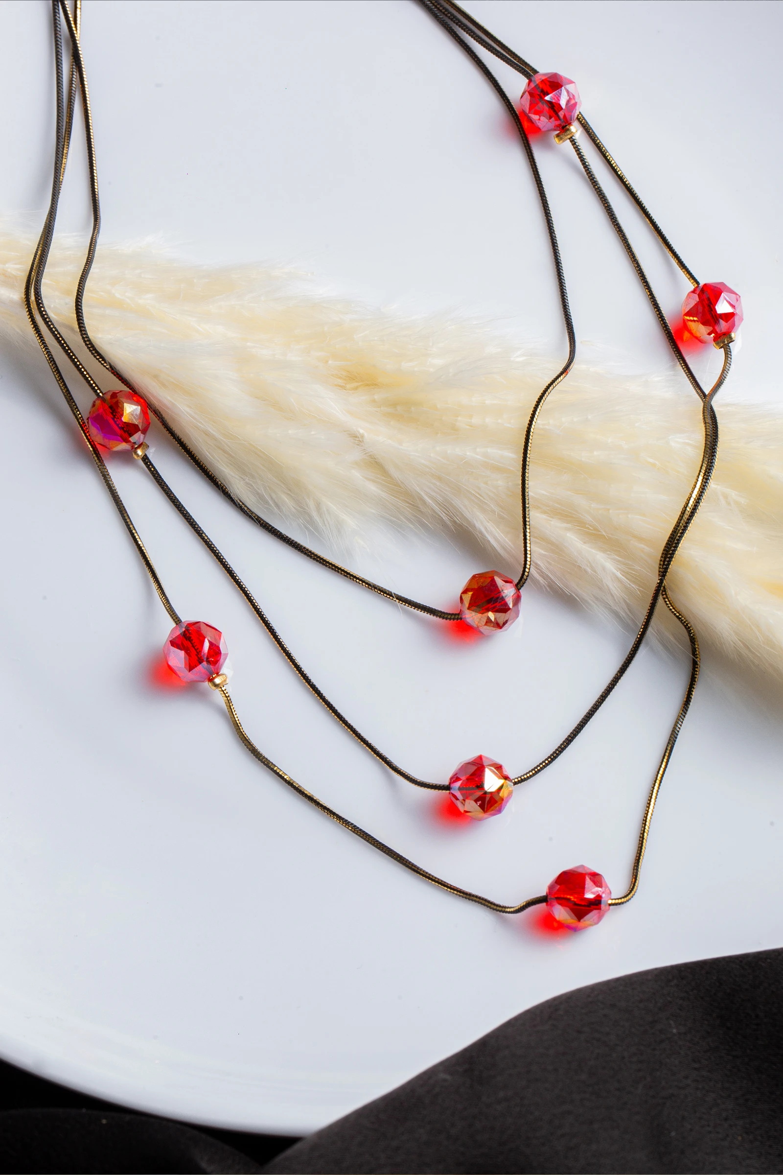 Elegant three-layered chain necklace featuring dazzling red crystal beads. A sophisticated and eye-...