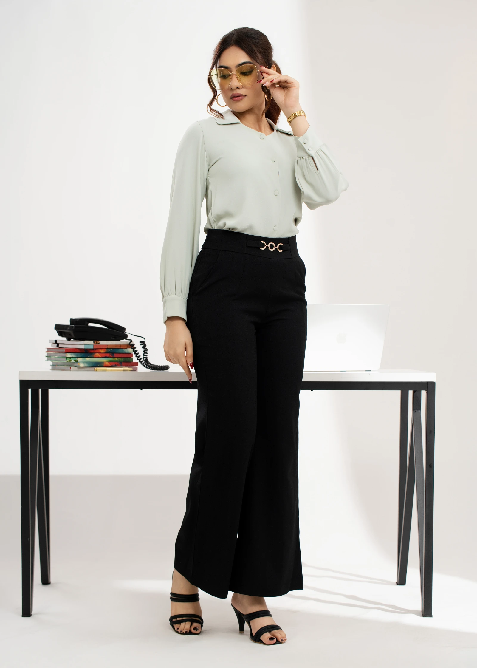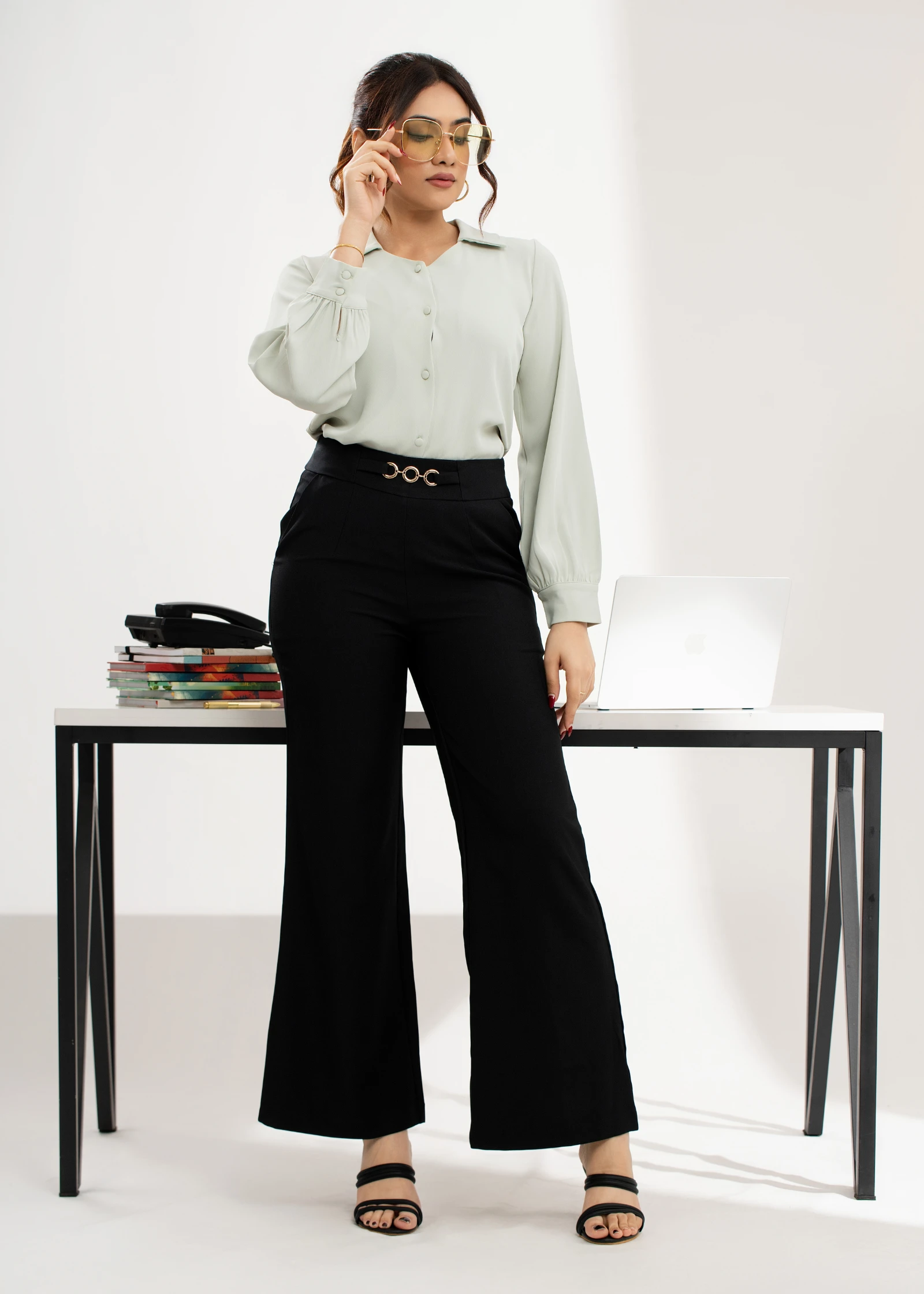 Introducing the Uptown Black Buckle Detail Flare Pant. These stylish trousers feature a flattering f...