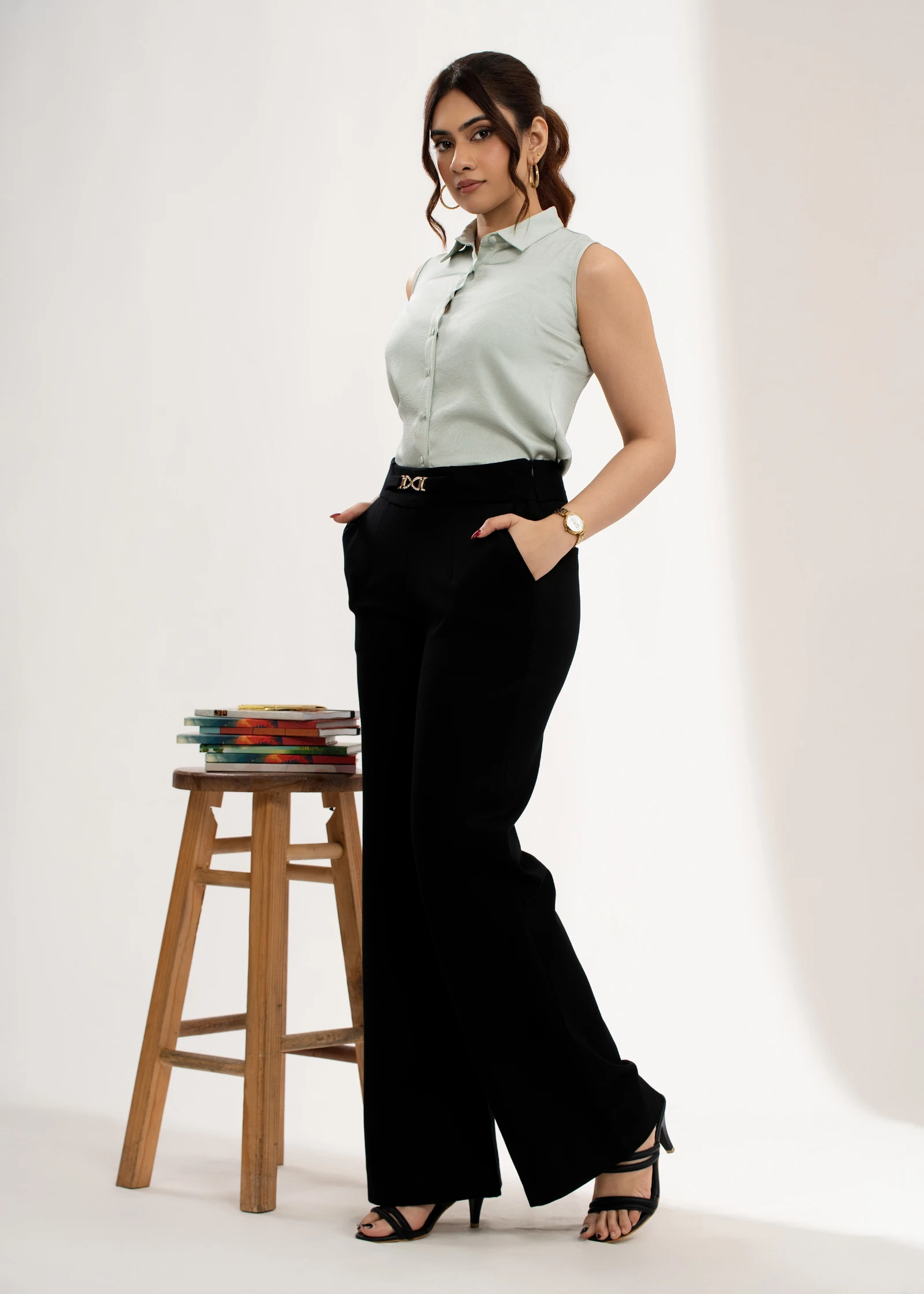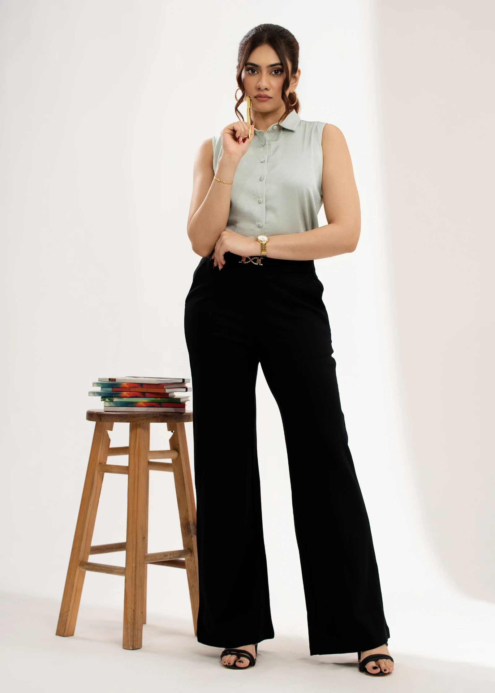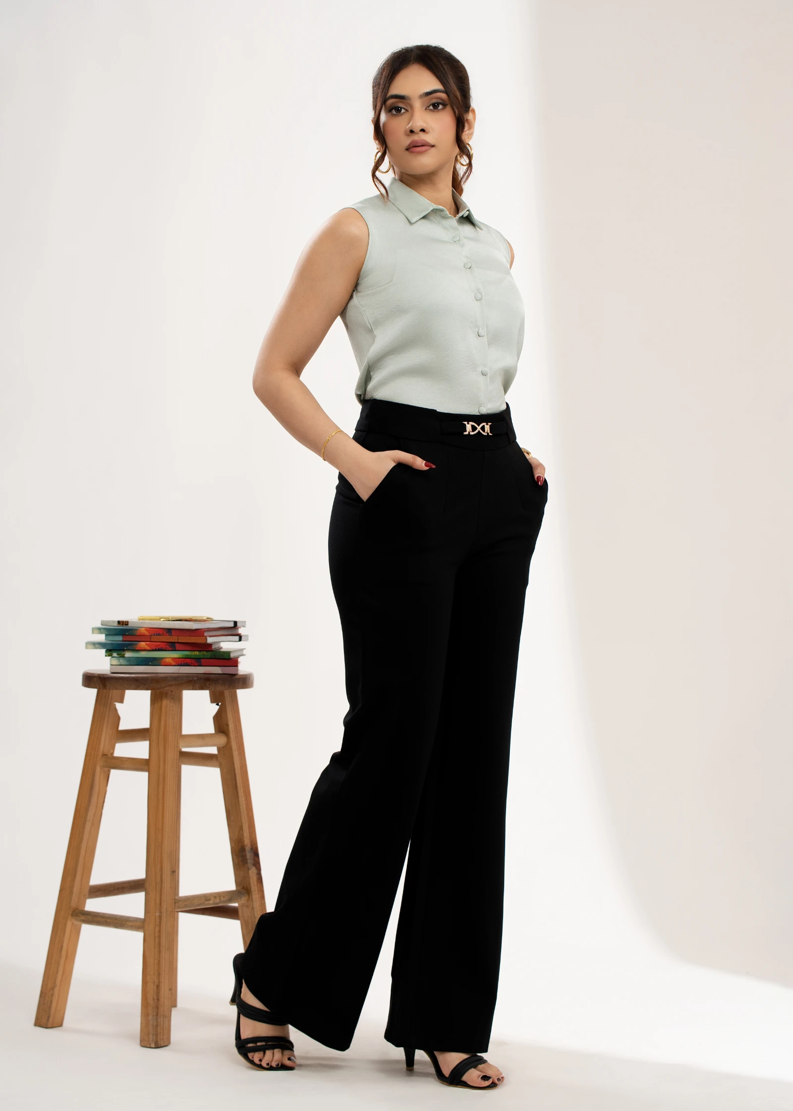 Elevate your style with the Uptown Buckle Detail Flare Pant. These chic trousers feature a flatterin...