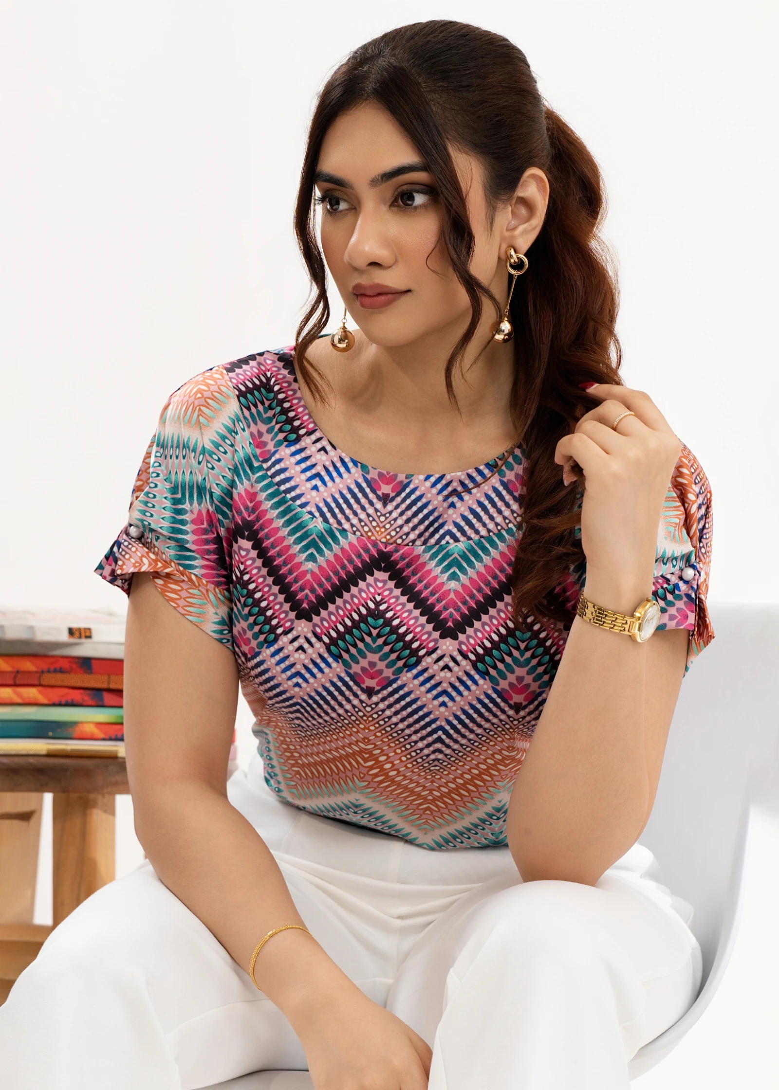 Effortless style meets modern chic with the Uptown Chevron Print Round Neckline Top. Featuring a sop...