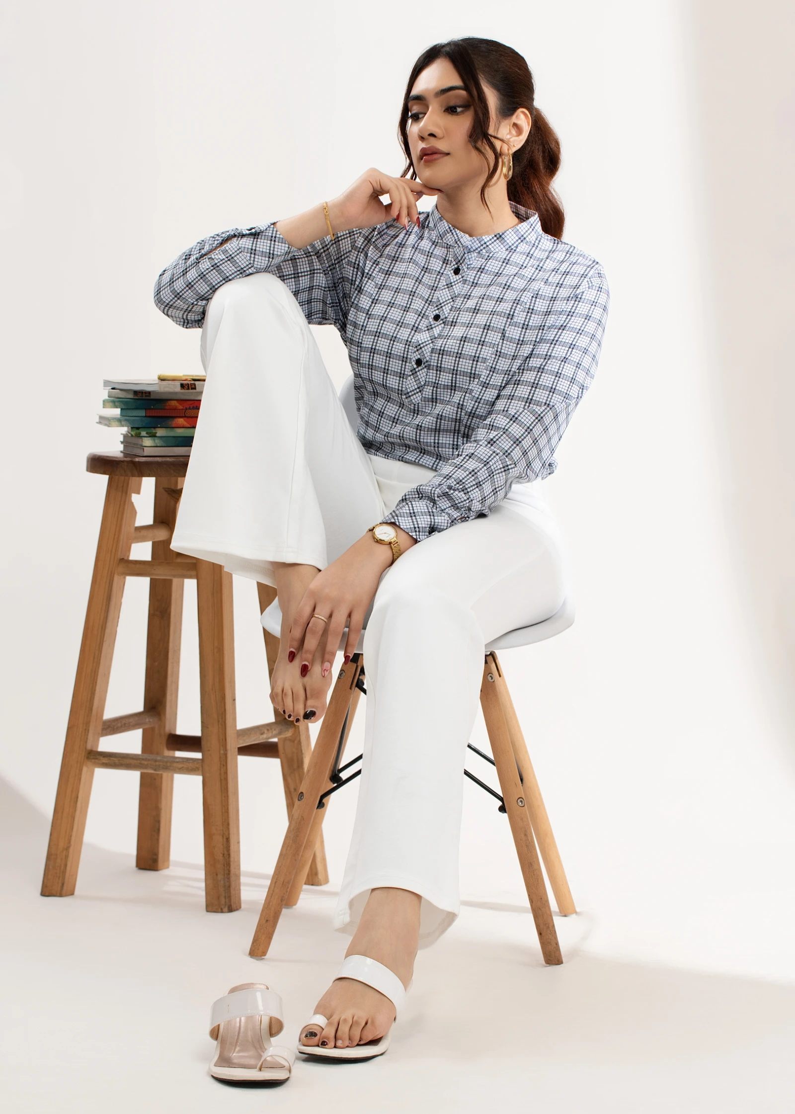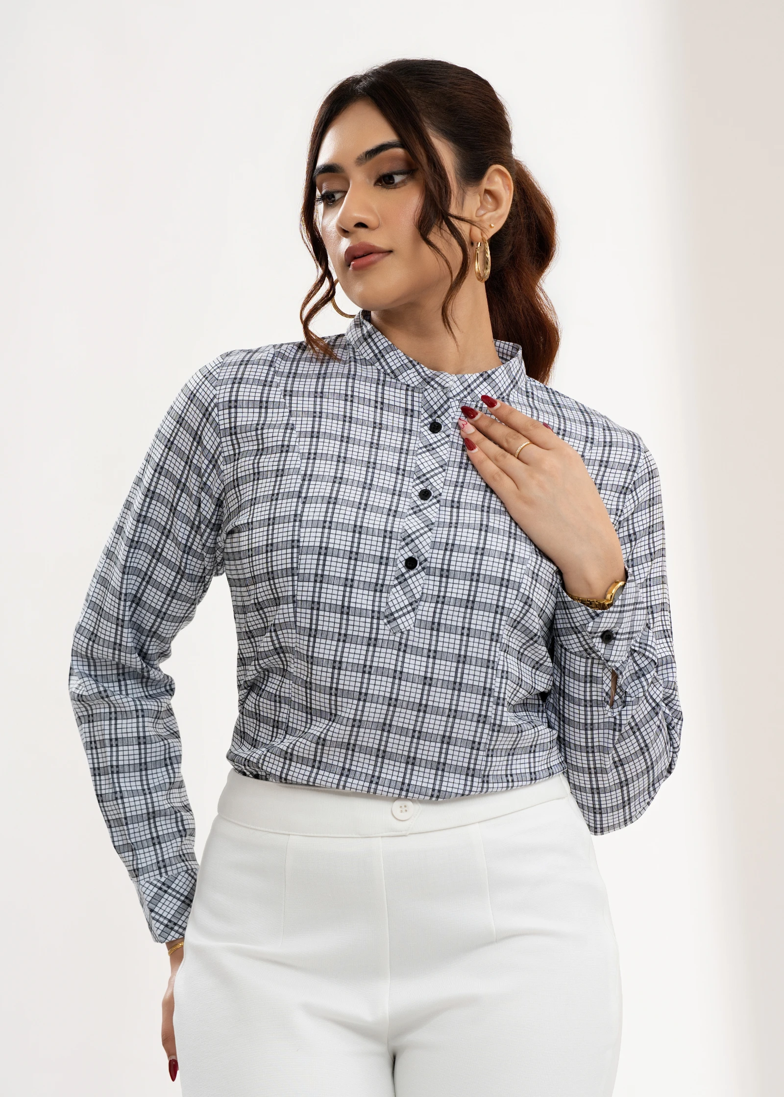 Elevate your everyday style with the Uptown Mandarin Collar Checkered Top. This chic top features a ...