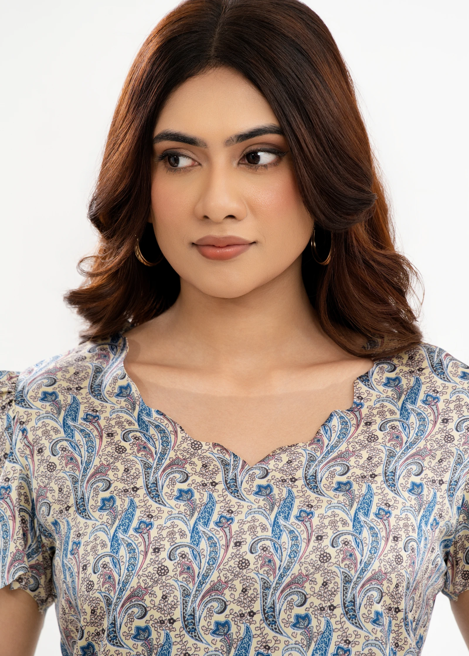 Elevate your everyday style with the Uptown Paisley Print Scalloped Sleeve Top. This charming piece ...