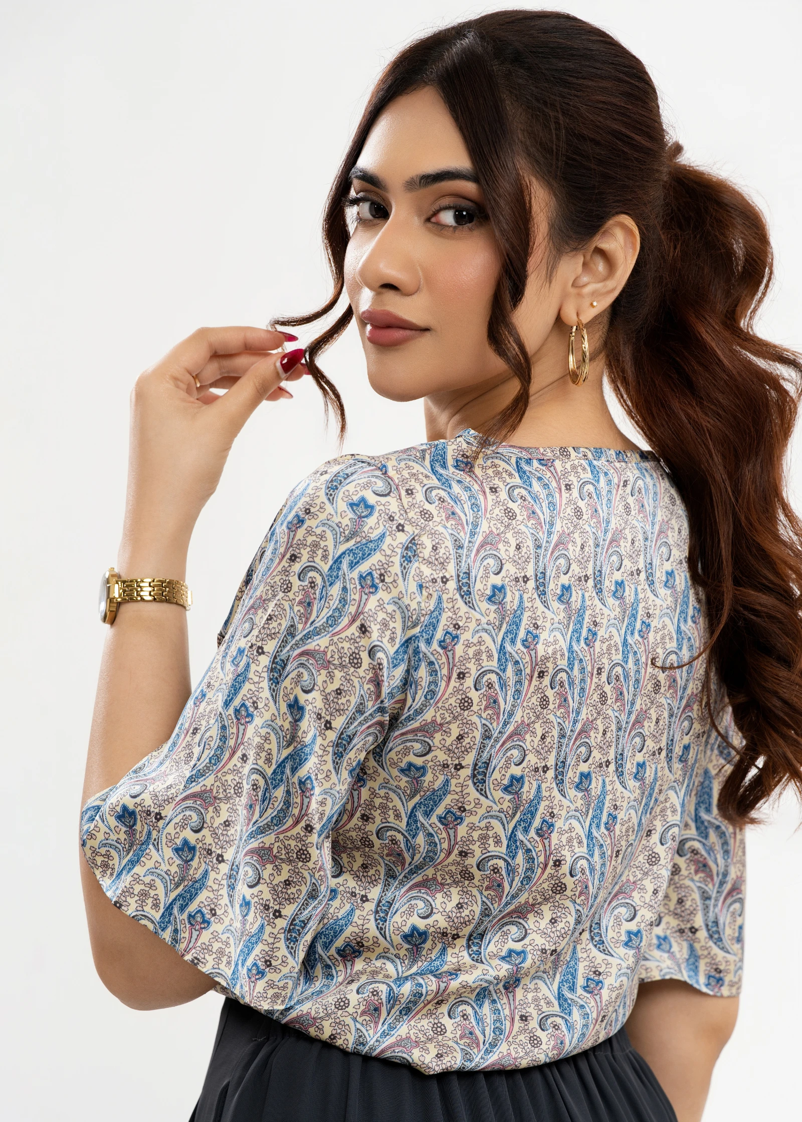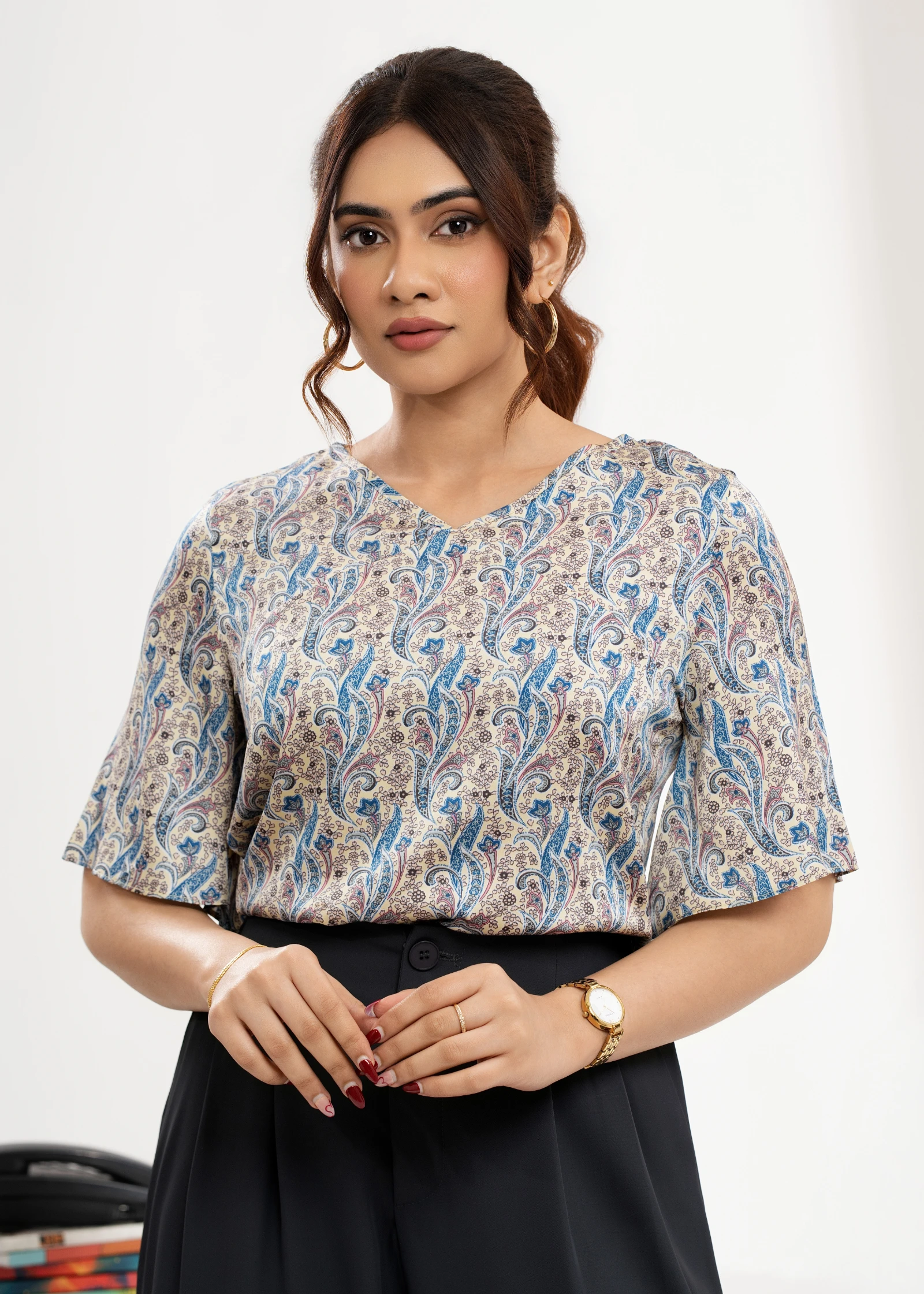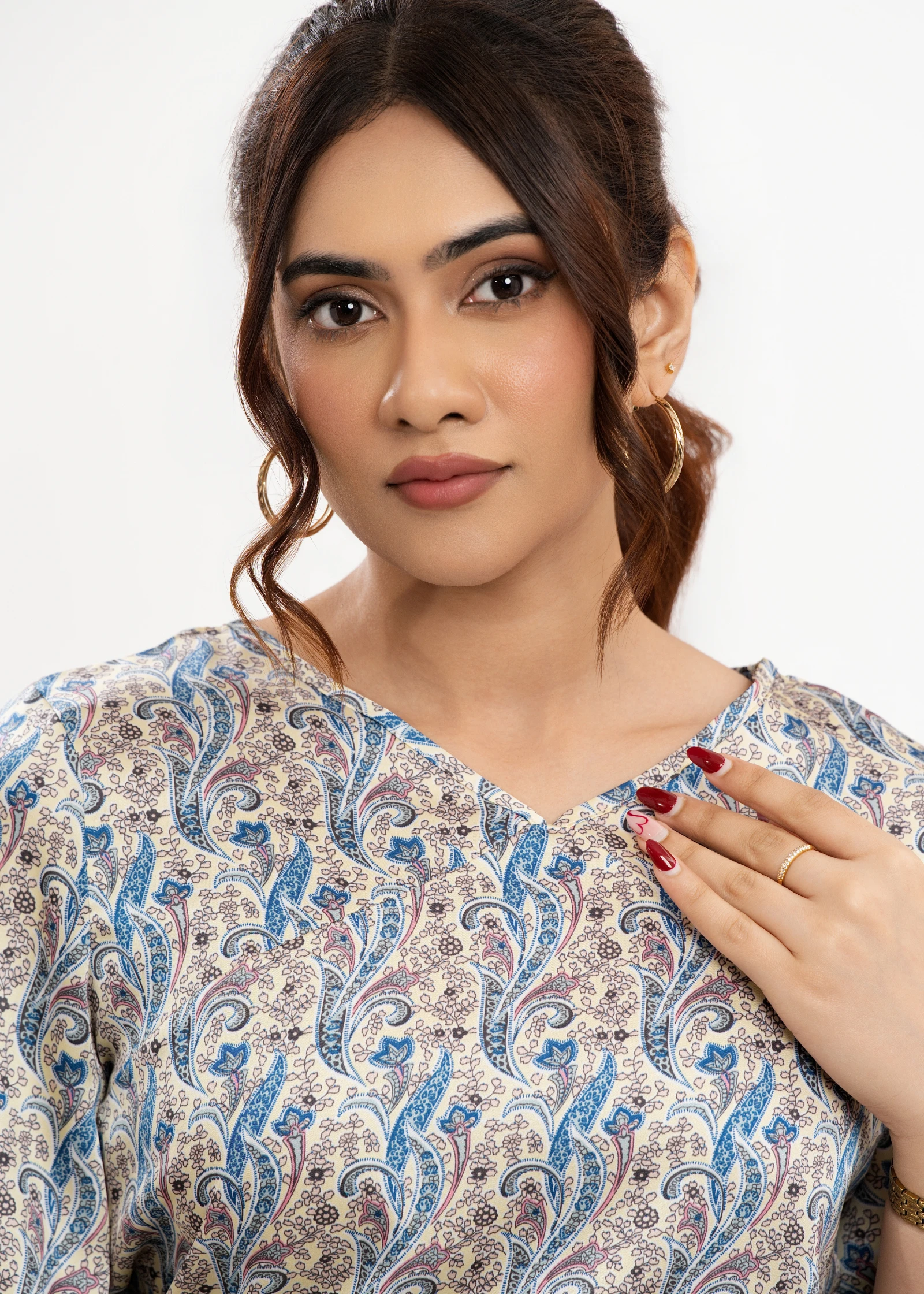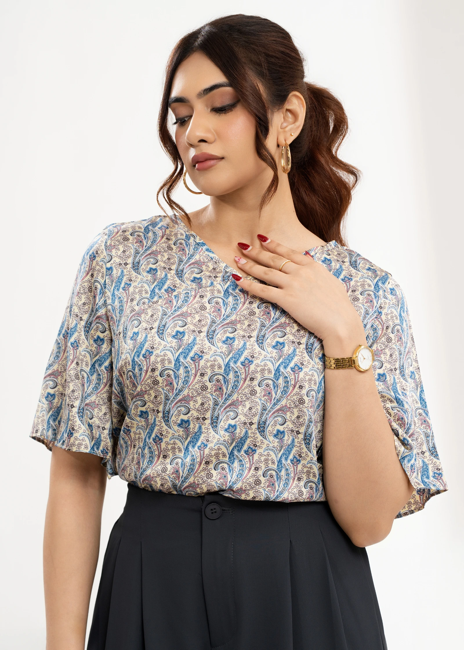 Elevate your everyday style with the Uptown V-neck Paisley Print Top. This chic top features a flatt...