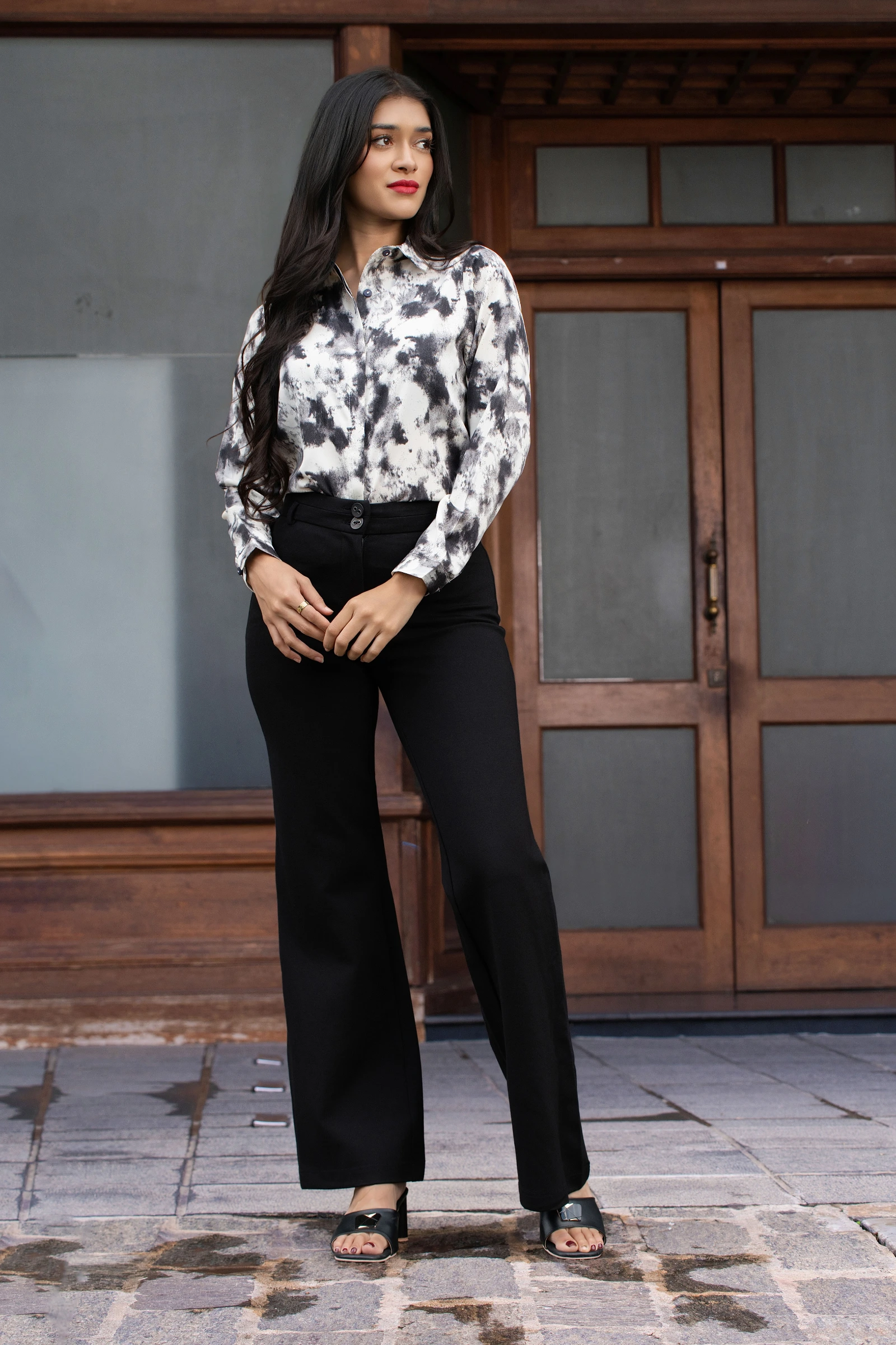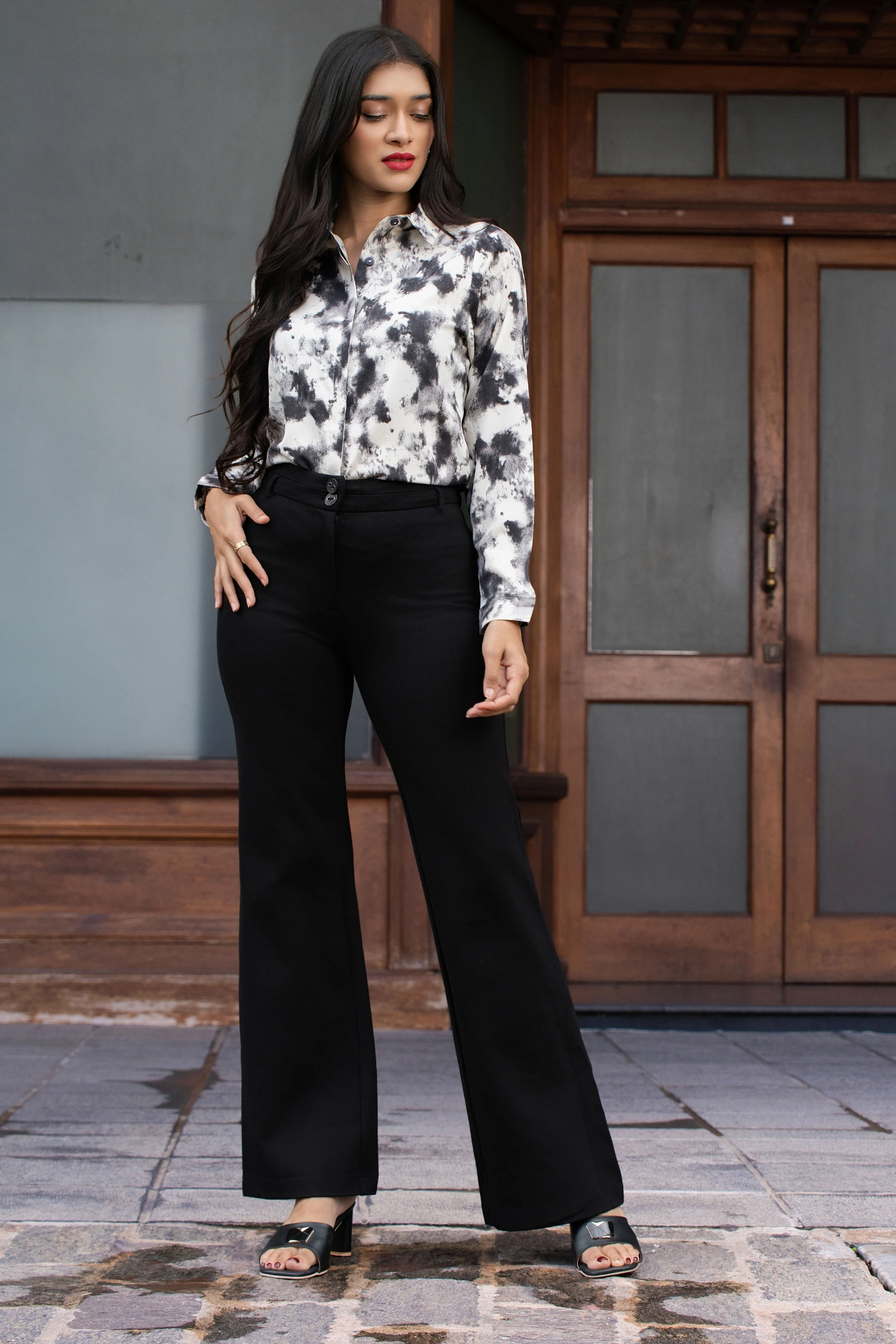 Introducing the Uptown Waist One Button Flare Pant. These chic trousers feature a flattering high wa...